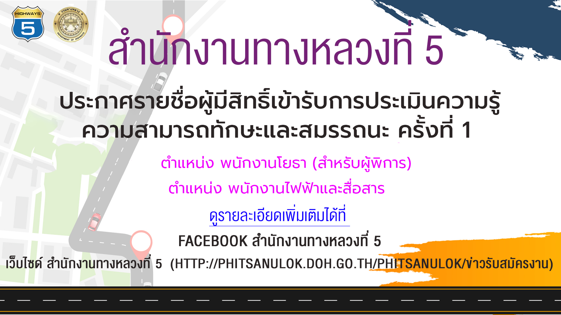 ประกาศรายชื่อผู้มีสิทธิ์เข้ารับการประเมินความรู้ความสามารถทักษะและสมรรถนะ ครั้งที่ 1 ตำแหน่ง พนักงานโยธา (สำหรับผู้พิการ) , ตำแหน่ง พนักงานไฟฟ้าและสื่อสาร