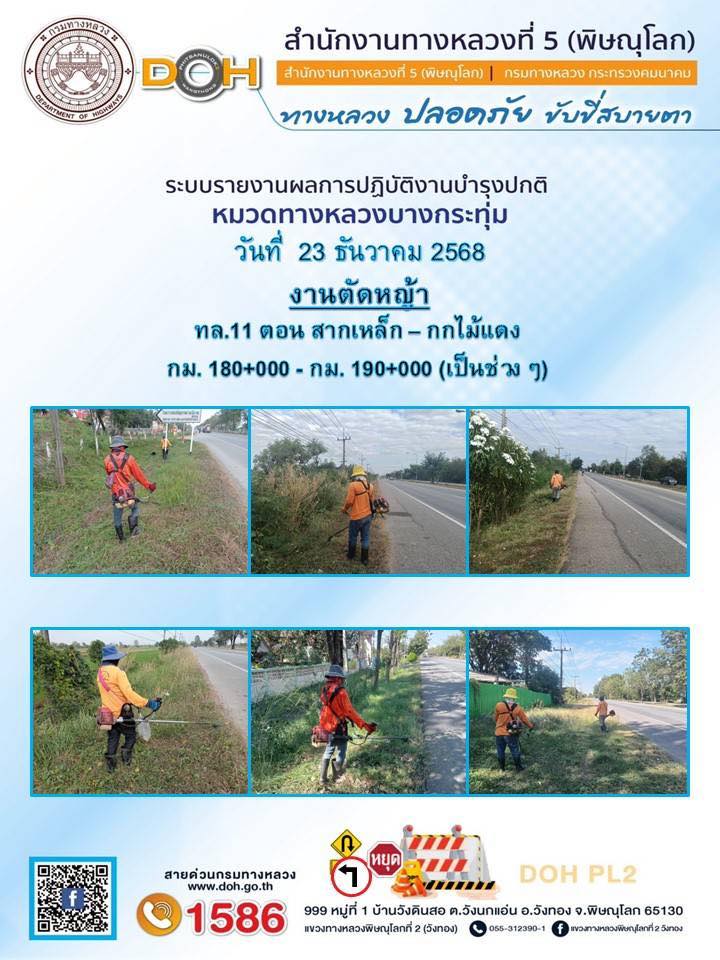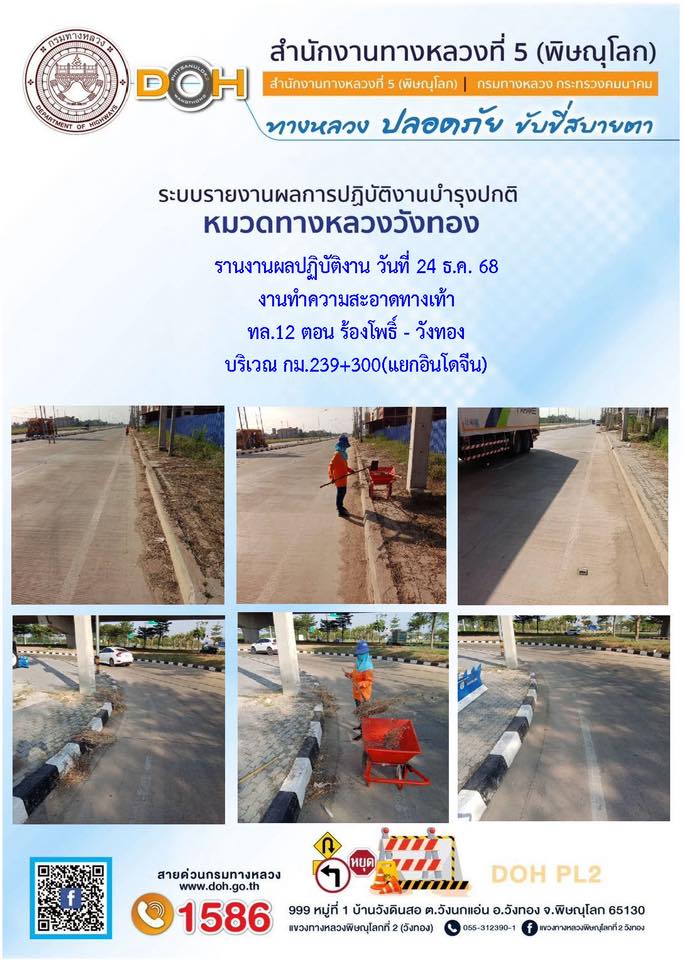วันที่ 27 ธันวาคม 2568 เวลา 16:00 น. งานอำนวยความปลอดภัยปฏิบัติการประจำจุดบริการ ออกตรวจสายทางควบคุมทำความสะอาดบำรุงรักษาป้ายจราจรและอำนวยความสะดวกแก่ผู้ใช้ถนน บริเวณ ทล.12 ตอน วังทอง - เข็กน้อย