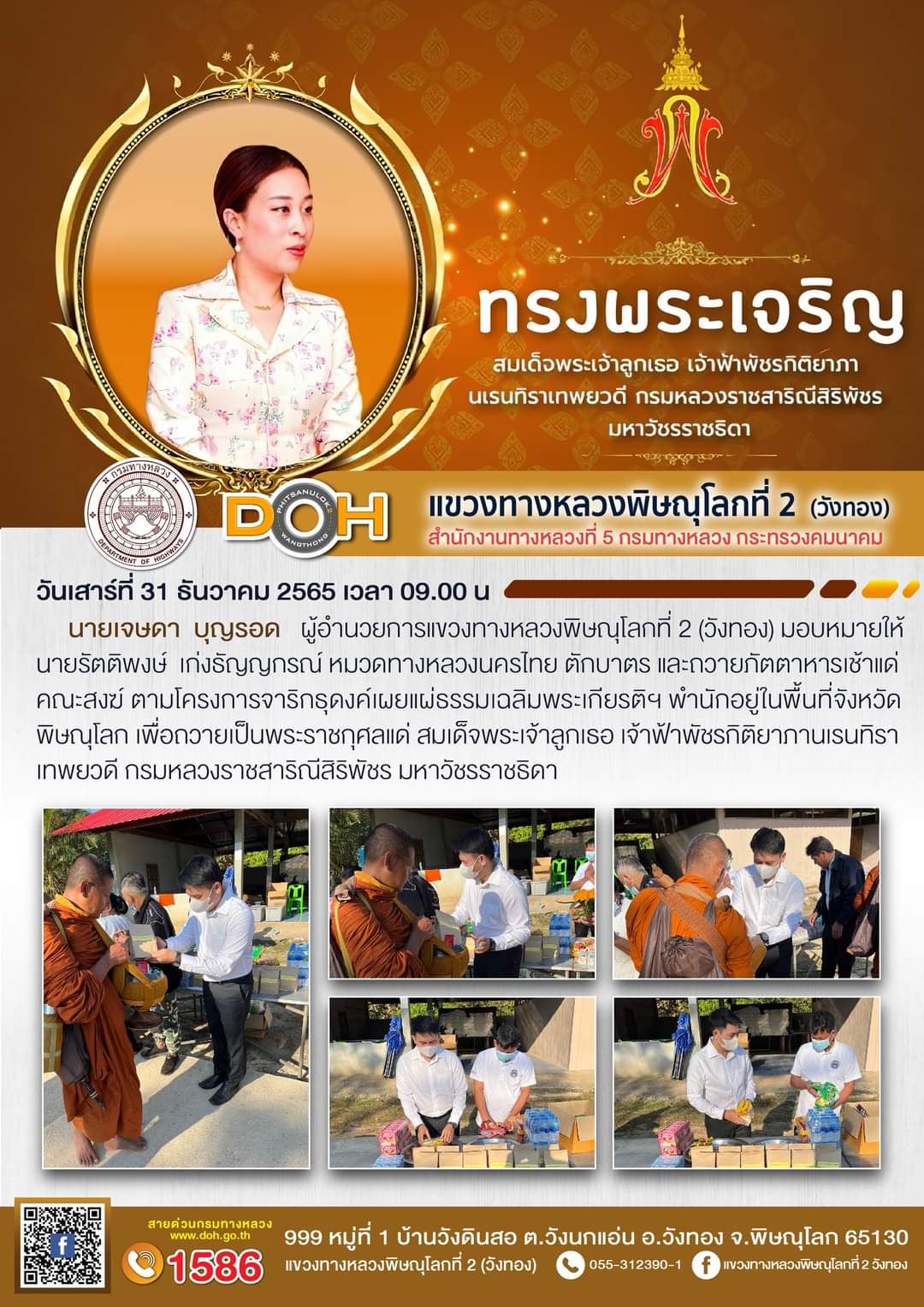 นายเจษดา บุญรอด ผู้อำนวยการแขวงทางหลวงพิษณุโลกที่ 2(วังทอง) มอบหมายให้ นายรัตติพงษ์ เก่งธัญญกรณ์ หมวดทางหลวงนครไทย ตักบาตร และถวายภัตตาหารเช้า