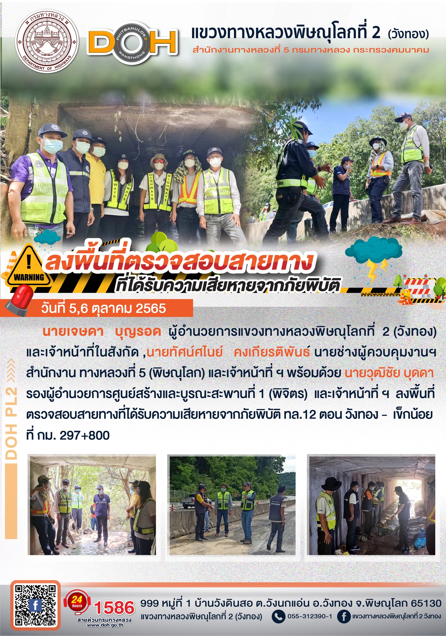 และเจ้าหน้าที่ ฯ ลงพื้นที่ตรวจสอบสายทางที่ได้รับความเสียหายจากภัยพิบัติทล.12 ตอน วังทอง - เข็กน้อย ที่ กม. 297+800