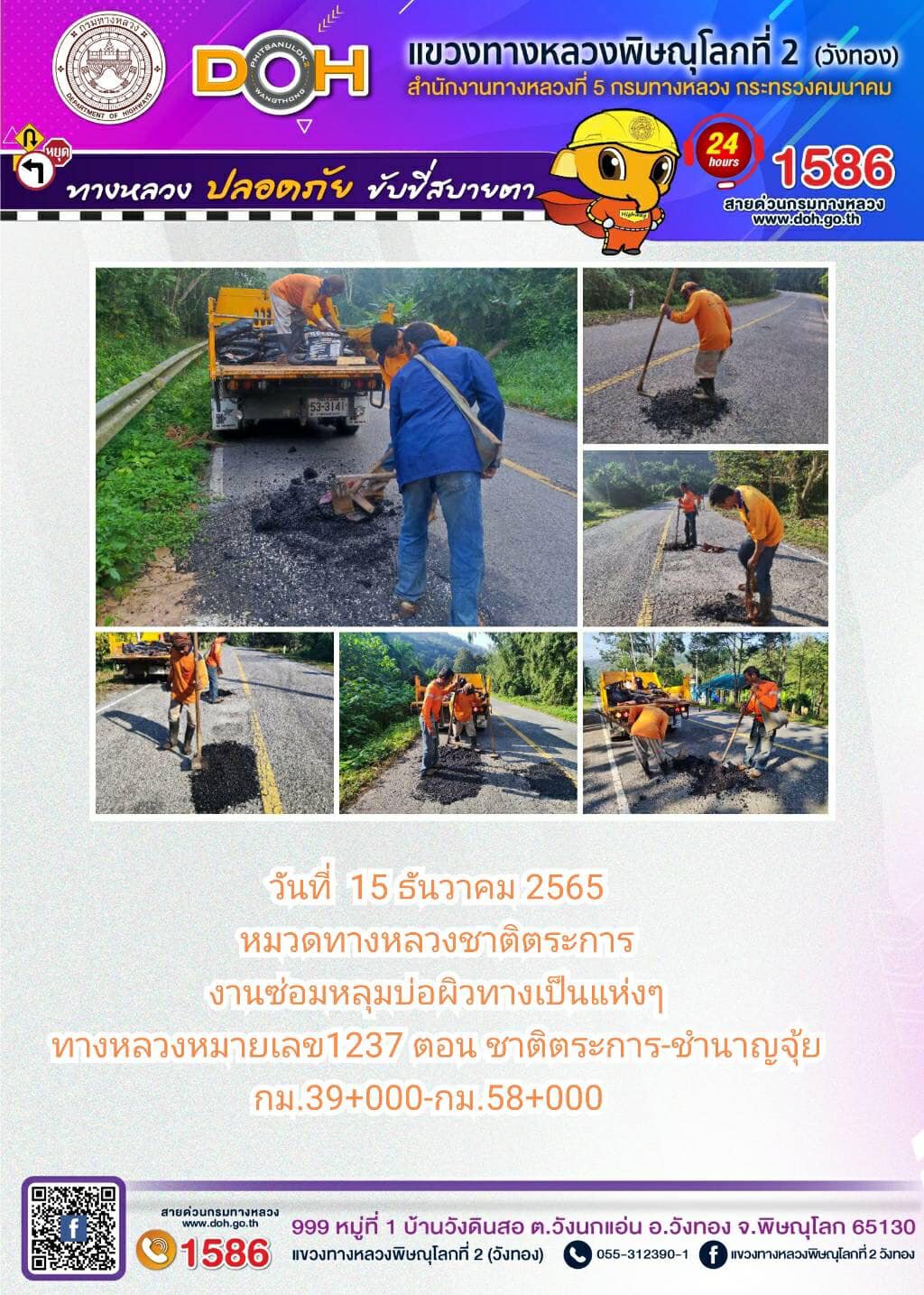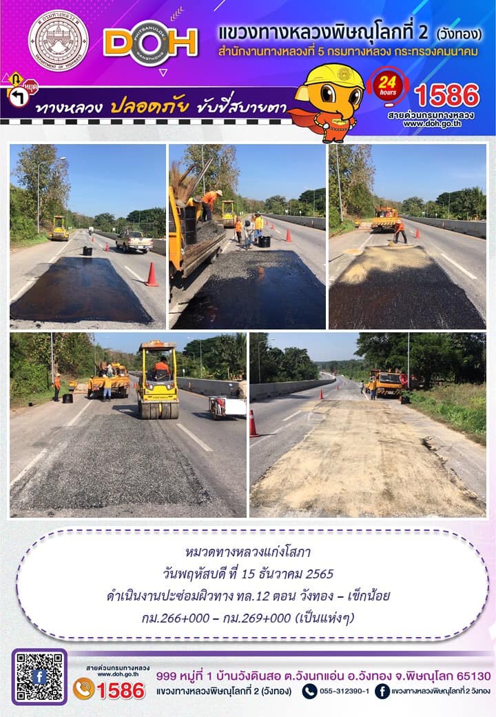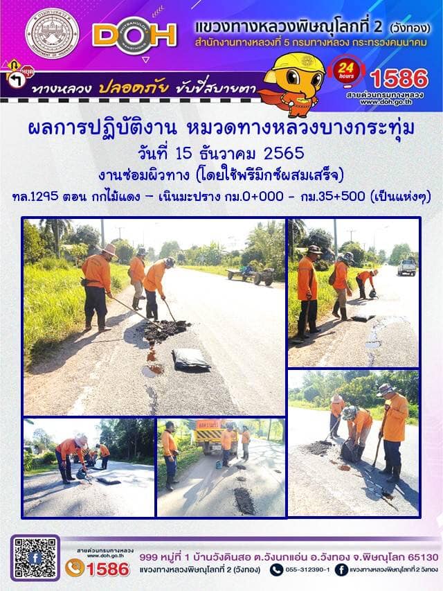 การปฏิบัติงานของ หมวดทางหลวง และ หน่วยงานในสังกัด เพื่ออำนวยความสะดวก และปลอดภัยให้กับประชาชนผู้ใช้เส้นทาง ประจำ วันพฤหัสบดีที่ 15 ธันวาคม 2565