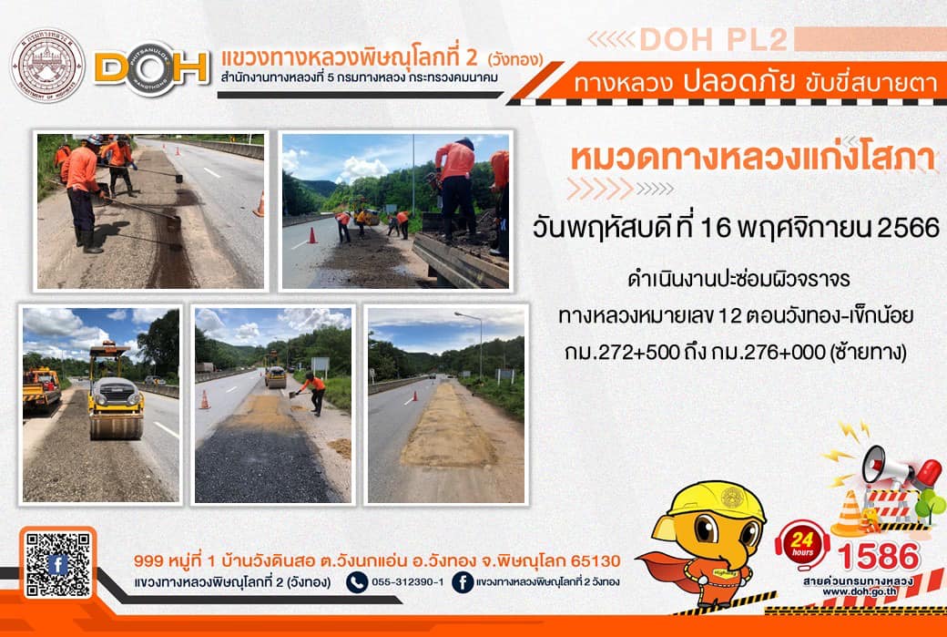 การปฏิบัติงานของ หมวดทางหลวง และ หน่วยงานในสังกัด เพื่ออำนวยความสะดวก และปลอดภัยให้กับประชาชนผู้ใช้เส้นทาง ประจำ วันพฤหัสบดีที่ 16 พฤศจิกายน 2566