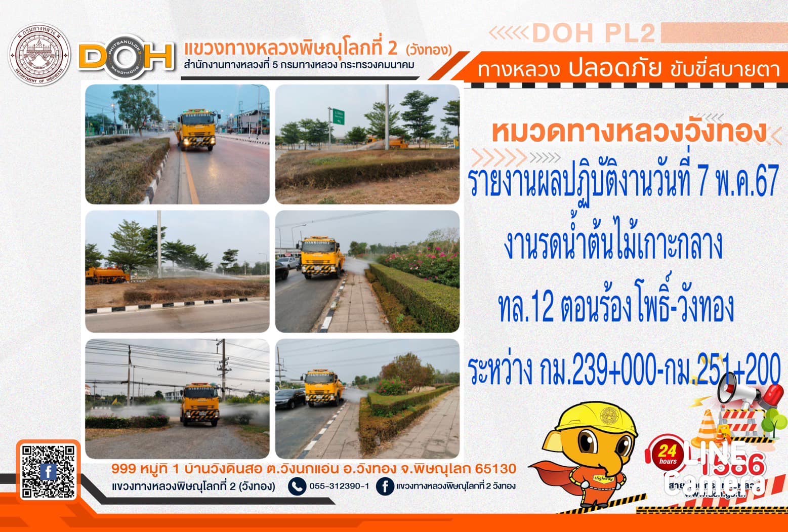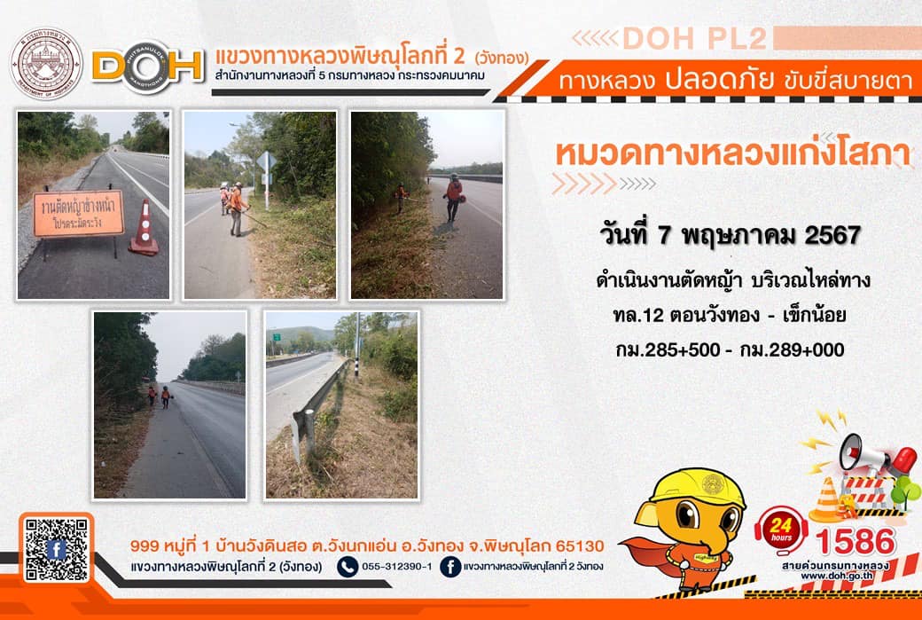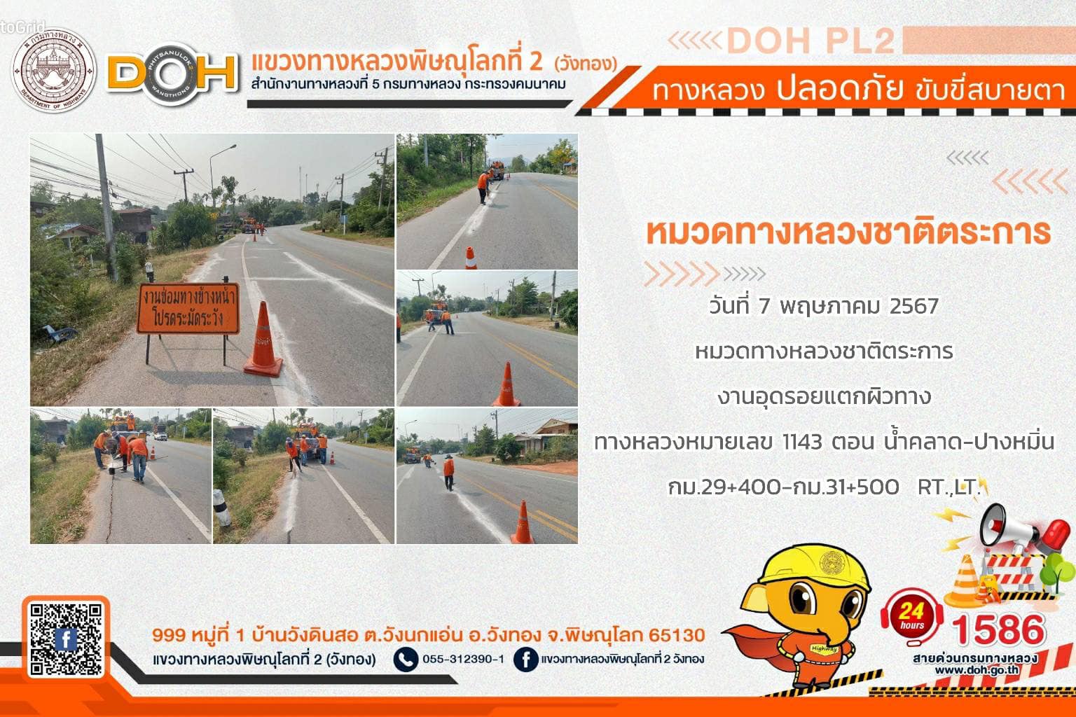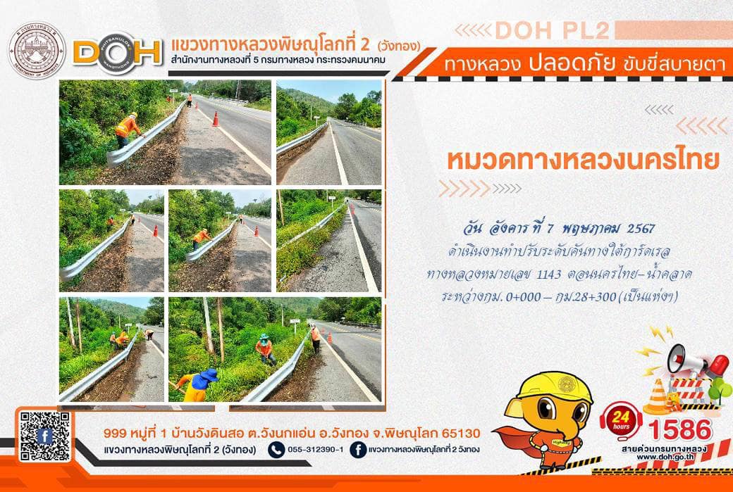 การปฏิบัติงานของ หมวดทางหลวง และ หน่วยงานในสังกัด เพื่ออำนวยความสะดวก และปลอดภัยให้กับประชาชนผู้ใช้เส้นทาง ประจำ วันอังคารที่ 7 พฤษภาคม 2567