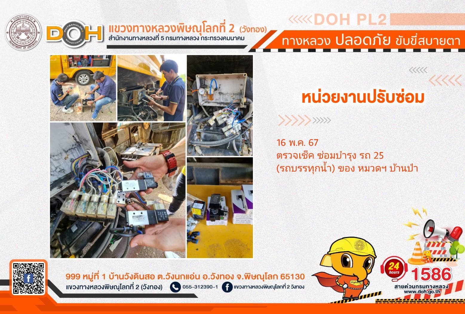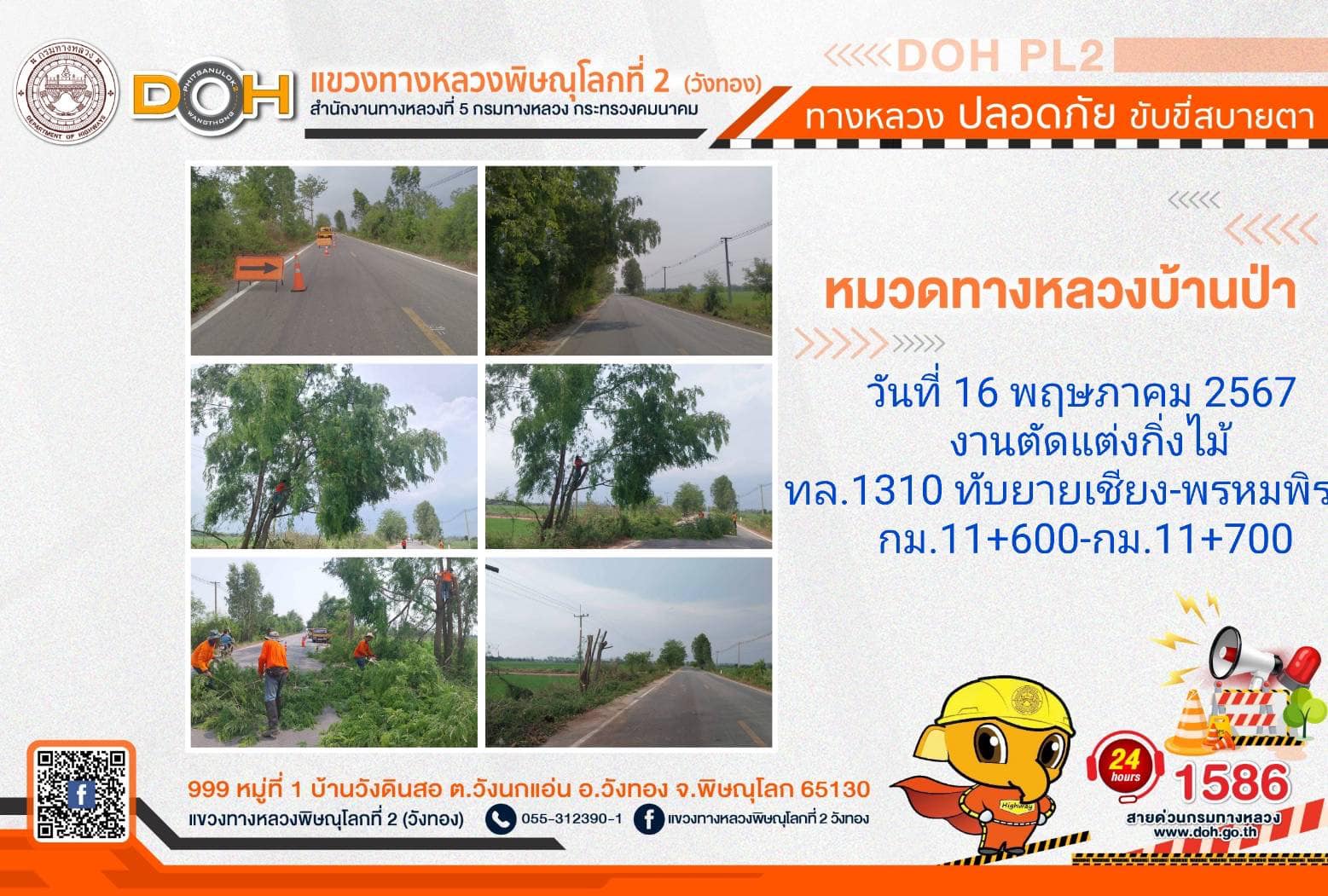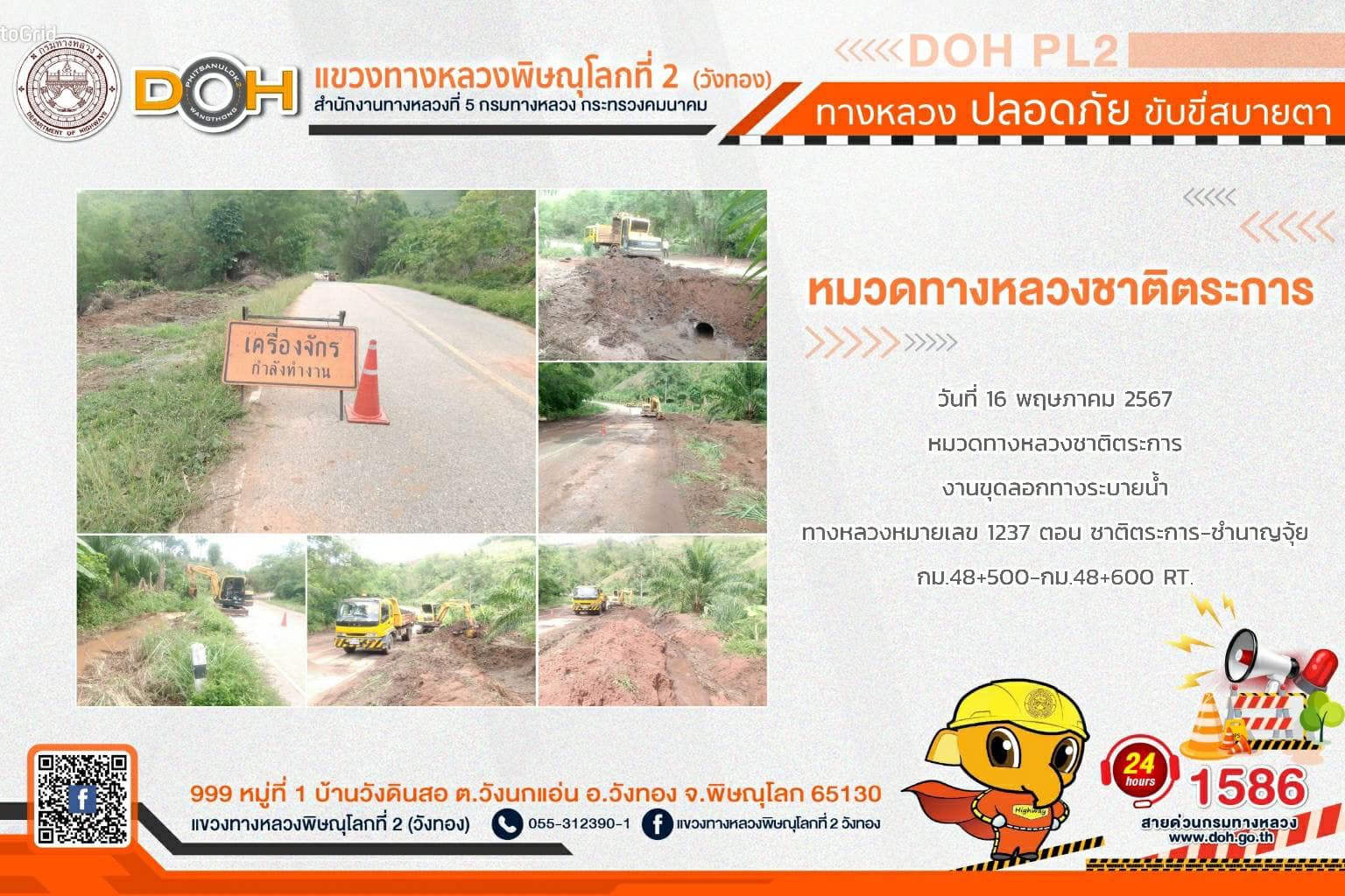 การปฏิบัติงานของ หมวดทางหลวง และ หน่วยงานในสังกัด เพื่ออำนวยความสะดวก และปลอดภัยให้กับประชาชนผู้ใช้เส้นทาง ประจำ วันพฤหัสบดีที่ 16 พฤษภาคม 2567