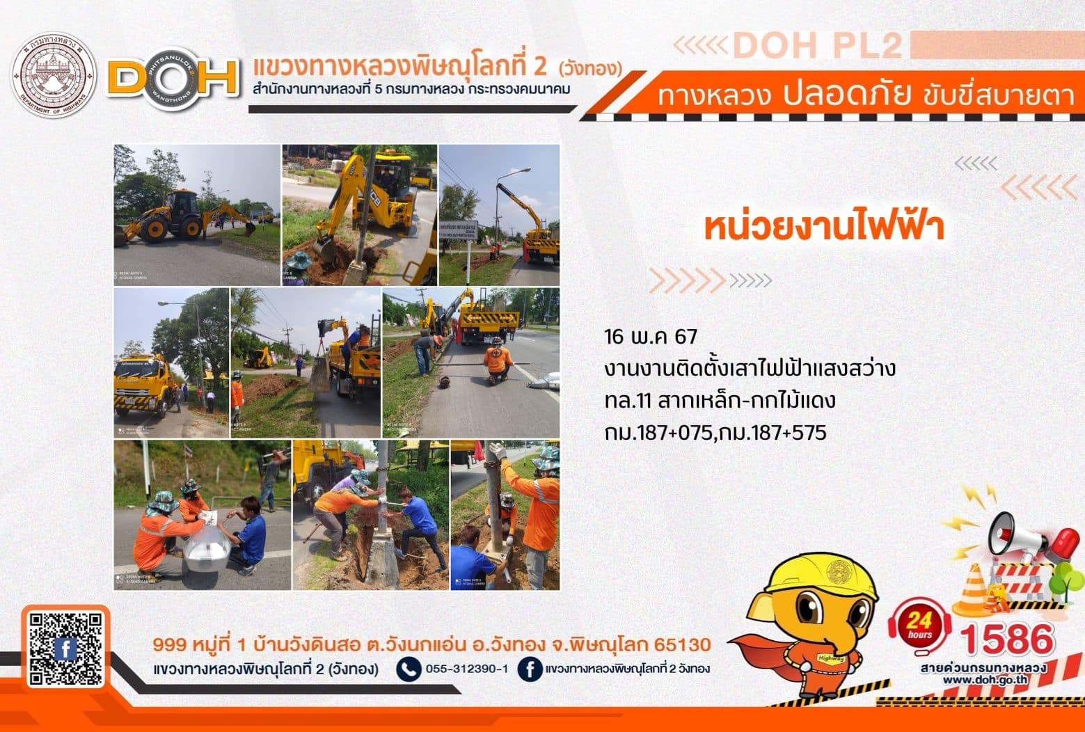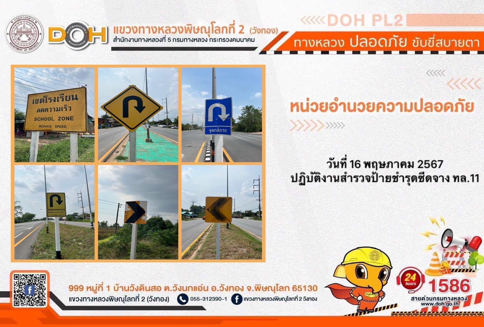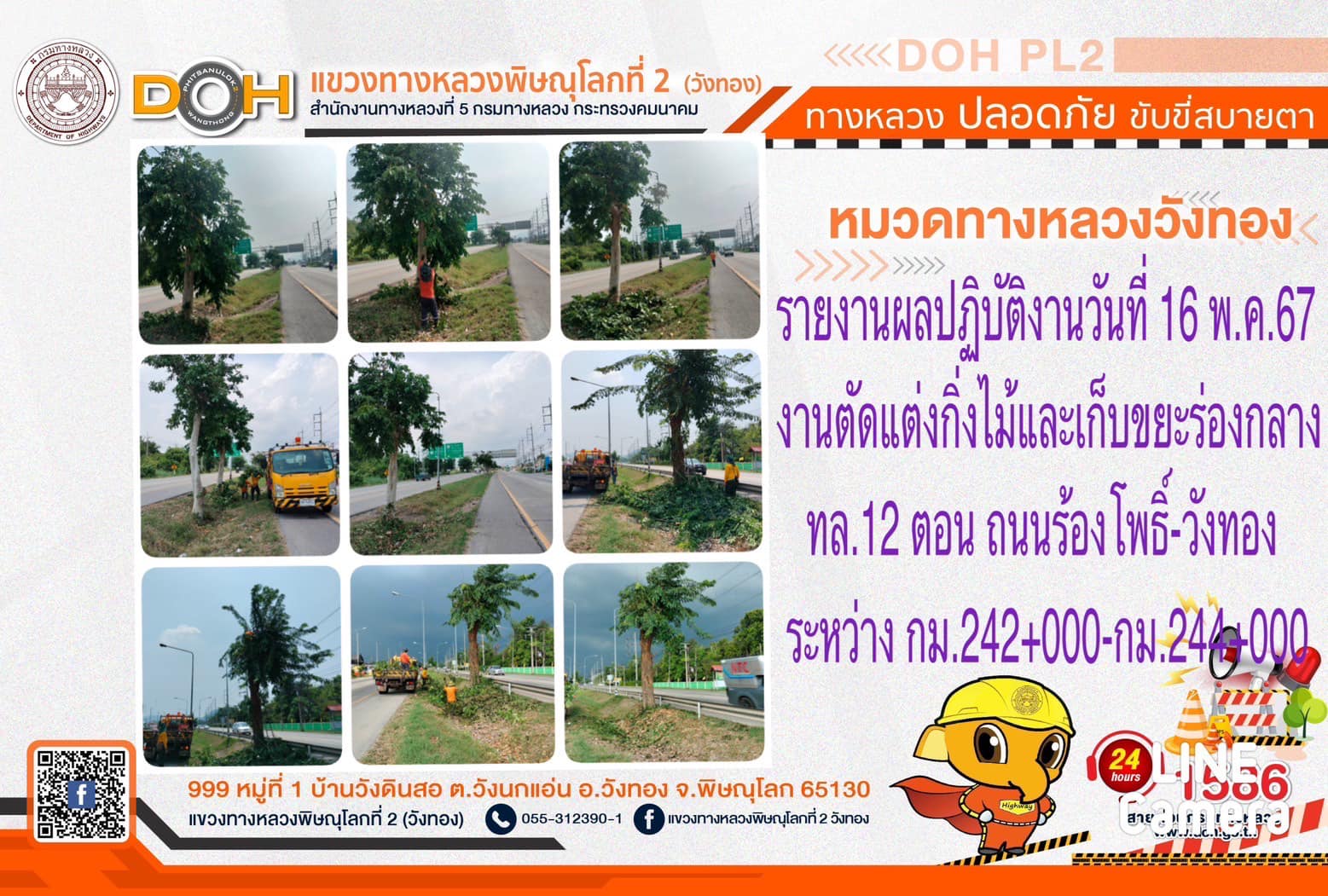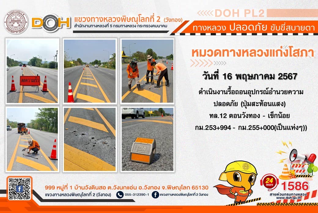 การปฏิบัติงานของ หมวดทางหลวง และ หน่วยงานในสังกัด เพื่ออำนวยความสะดวก และปลอดภัยให้กับประชาชนผู้ใช้เส้นทาง ประจำ วันพฤหัสบดีที่ 16 พฤษภาคม 2567