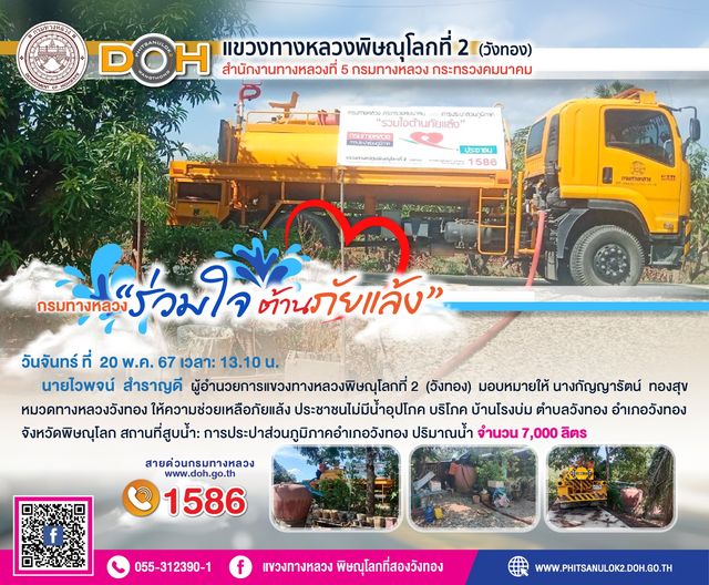 นายไวพจน์ สำราญดี ผู้อำนวยการแขวงทางหลวงพิษณุโลกที่ 2(วังทอง) มอบหมายให้ นางกัญญารัตน์ ทองสุข หมวดทางหลวงวังทอง ให้ความช่วยเหลือภัยแล้ง ประชาชนไม่มีน้ำอุปโภค บริโภค บ้านโรงบ่ม ตำบลวังทอง อำเภอวังทอง จังหวัดพิษณุโลก