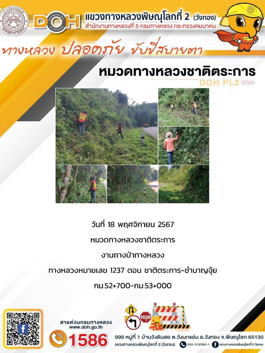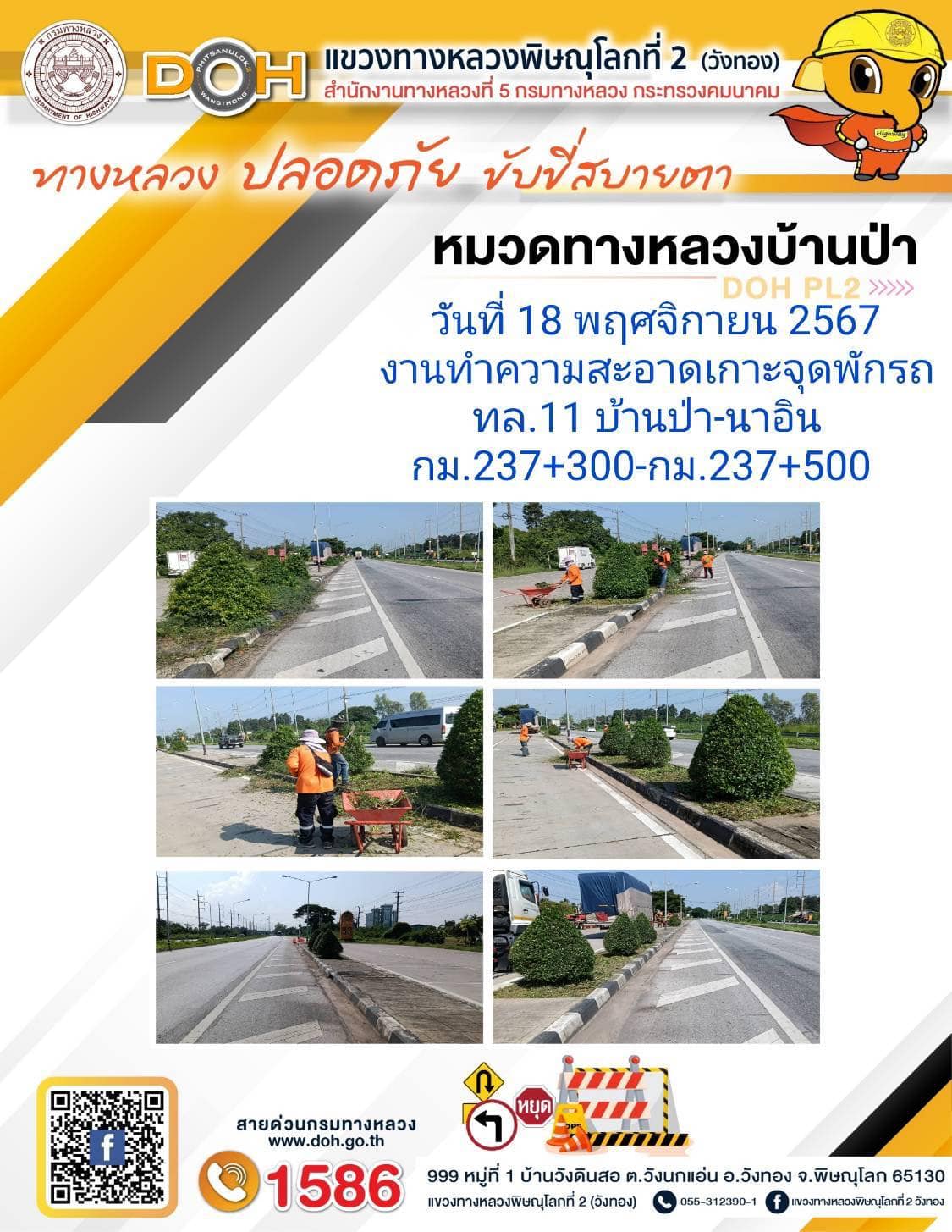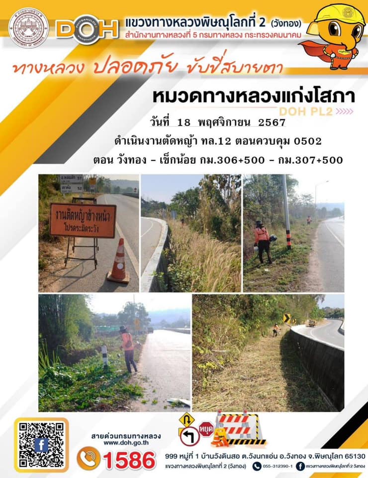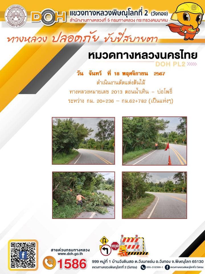 การปฏิบัติงานของ หมวดทางหลวง และ หน่วยงานในสังกัด เพื่ออำนวยความสะดวก และปลอดภัยให้กับประชาชนผู้ใช้เส้นทาง ประจำ วันจันทร์ ที่ 18 พฤศจิกายน 2567