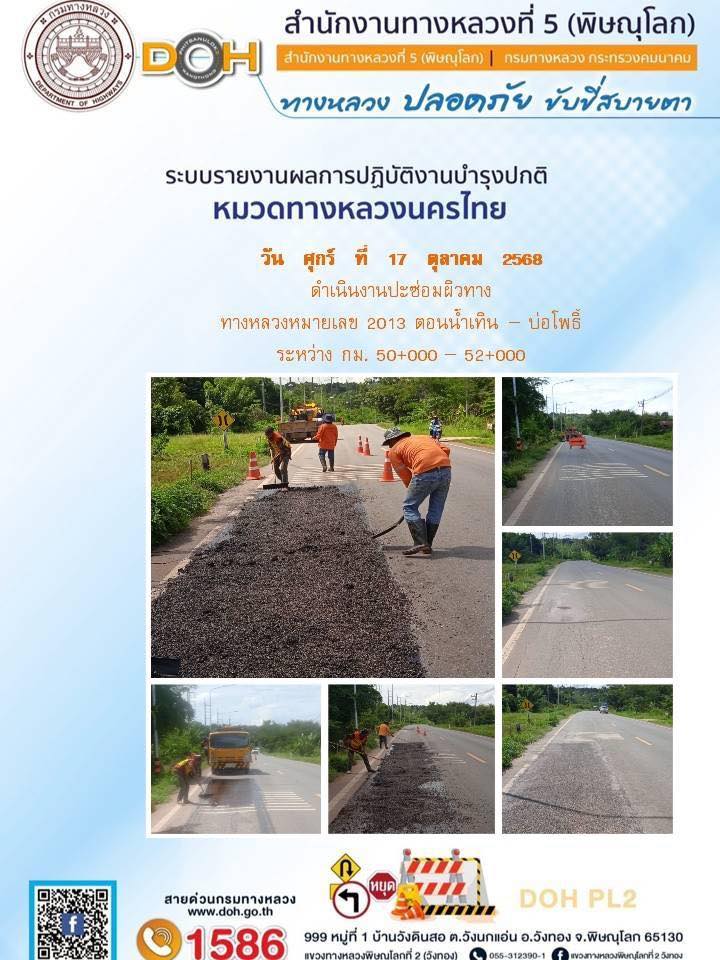 การปฏิบัติงานของ หมวดทางหลวง และ หน่วยงานในสังกัด เพื่ออำนวยความสะดวก และปลอดภัยให้กับประชาชนผู้ใช้เส้นทาง ประจำวันศุกร์ ที่ 17 ตุลาคม 2568