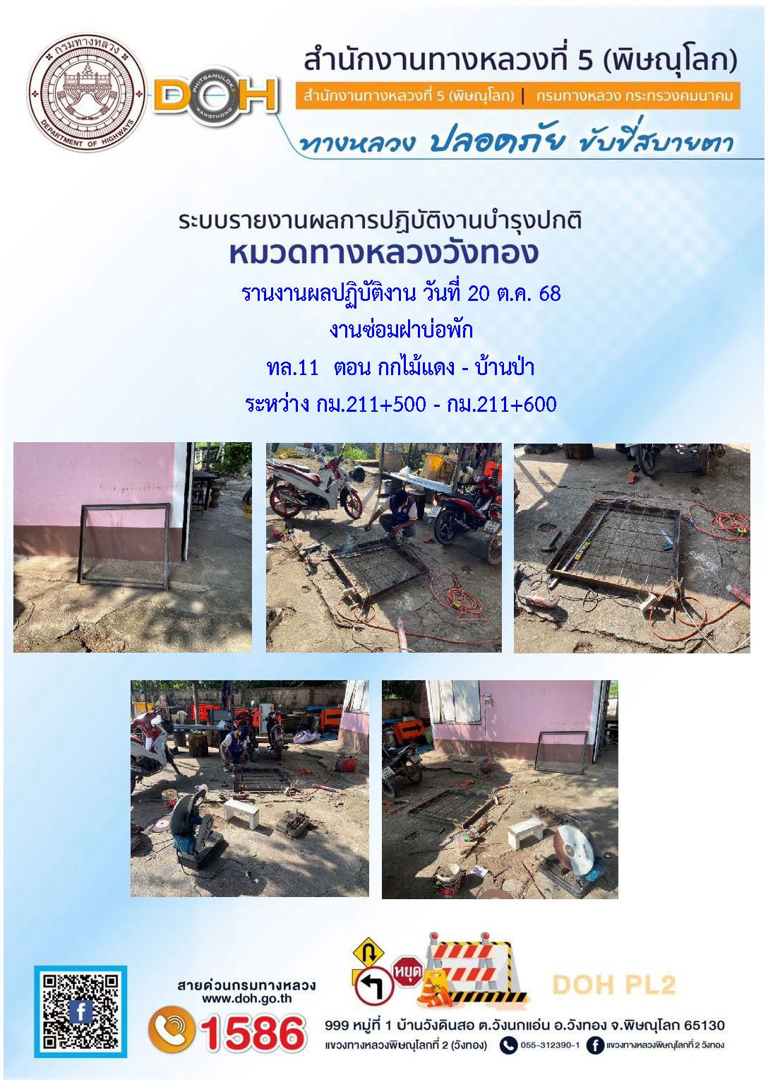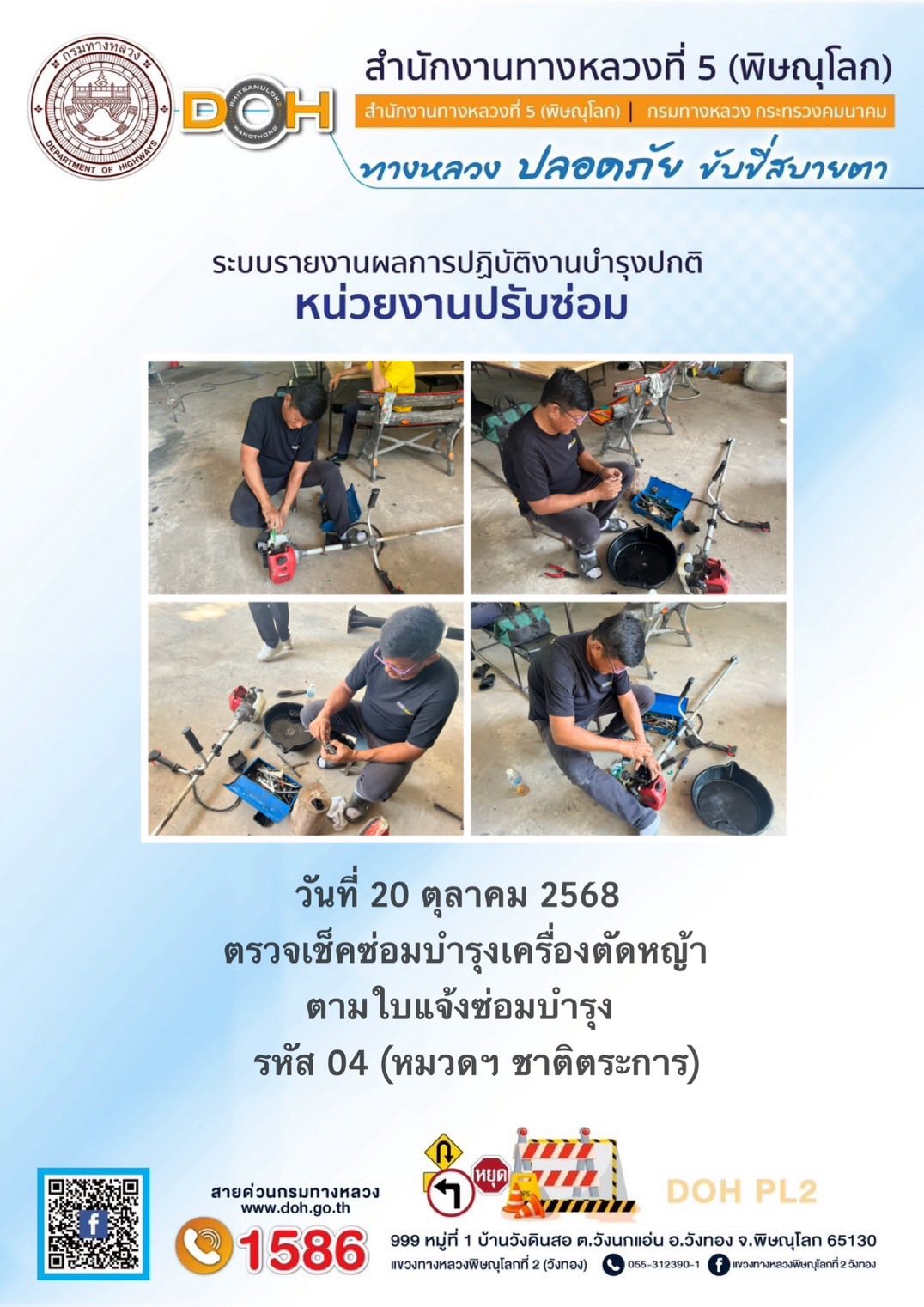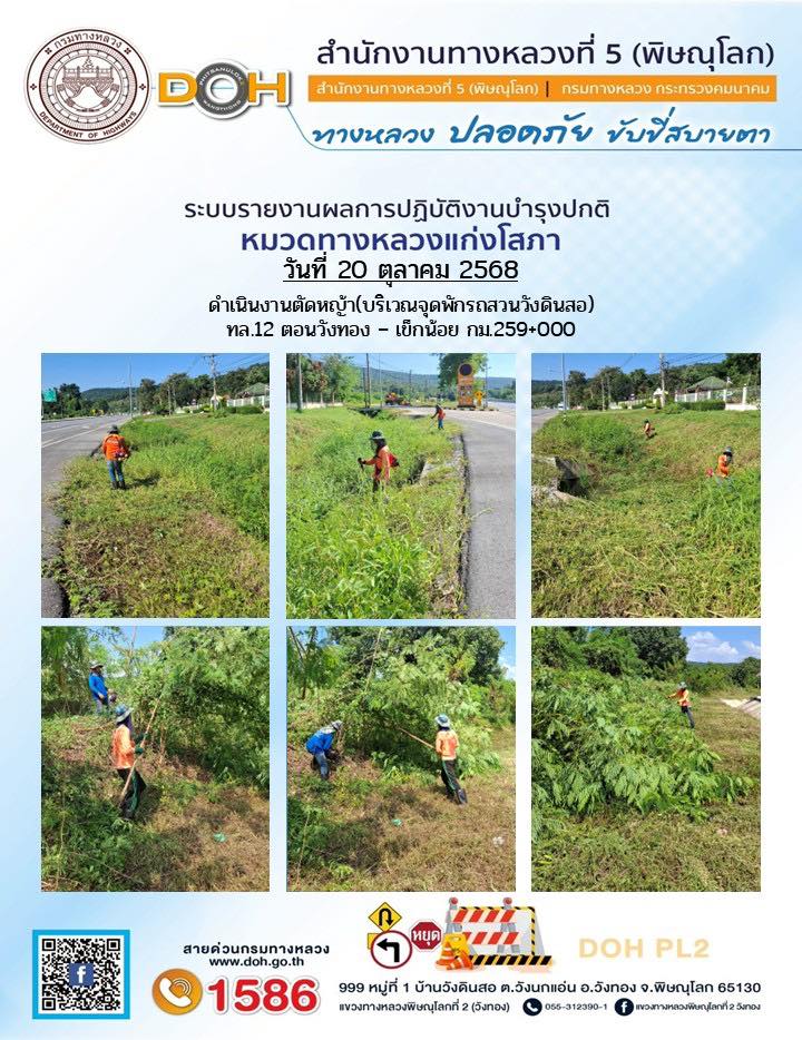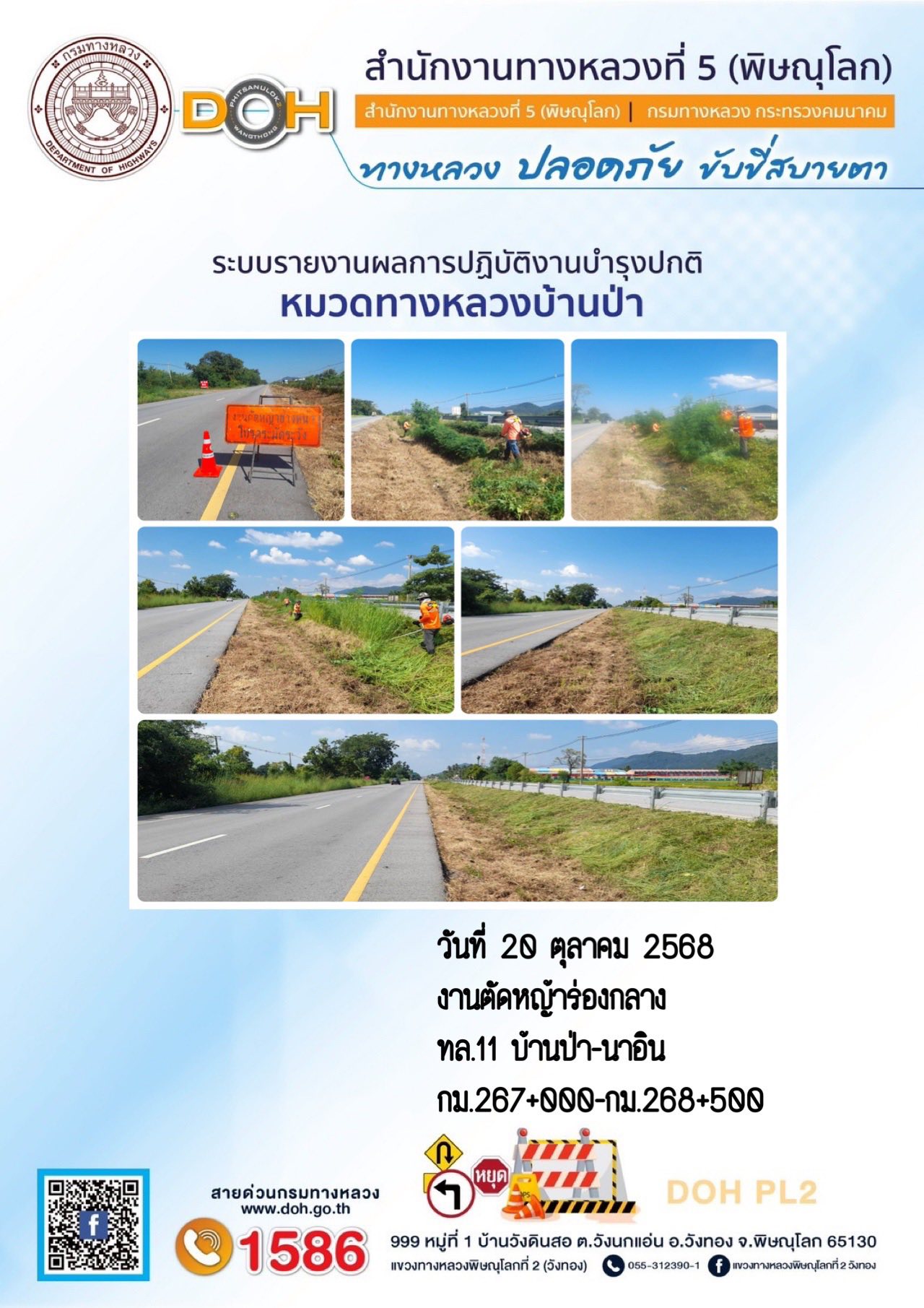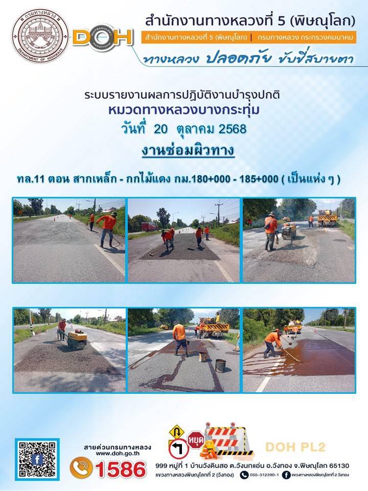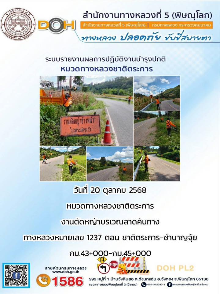 การปฏิบัติงานของ หมวดทางหลวง และ หน่วยงานในสังกัด เพื่ออำนวยความสะดวก และปลอดภัยให้กับประชาชนผู้ใช้เส้นทาง ประจำวันจันทร์ ที่ 20 ตุลาคม 2568
