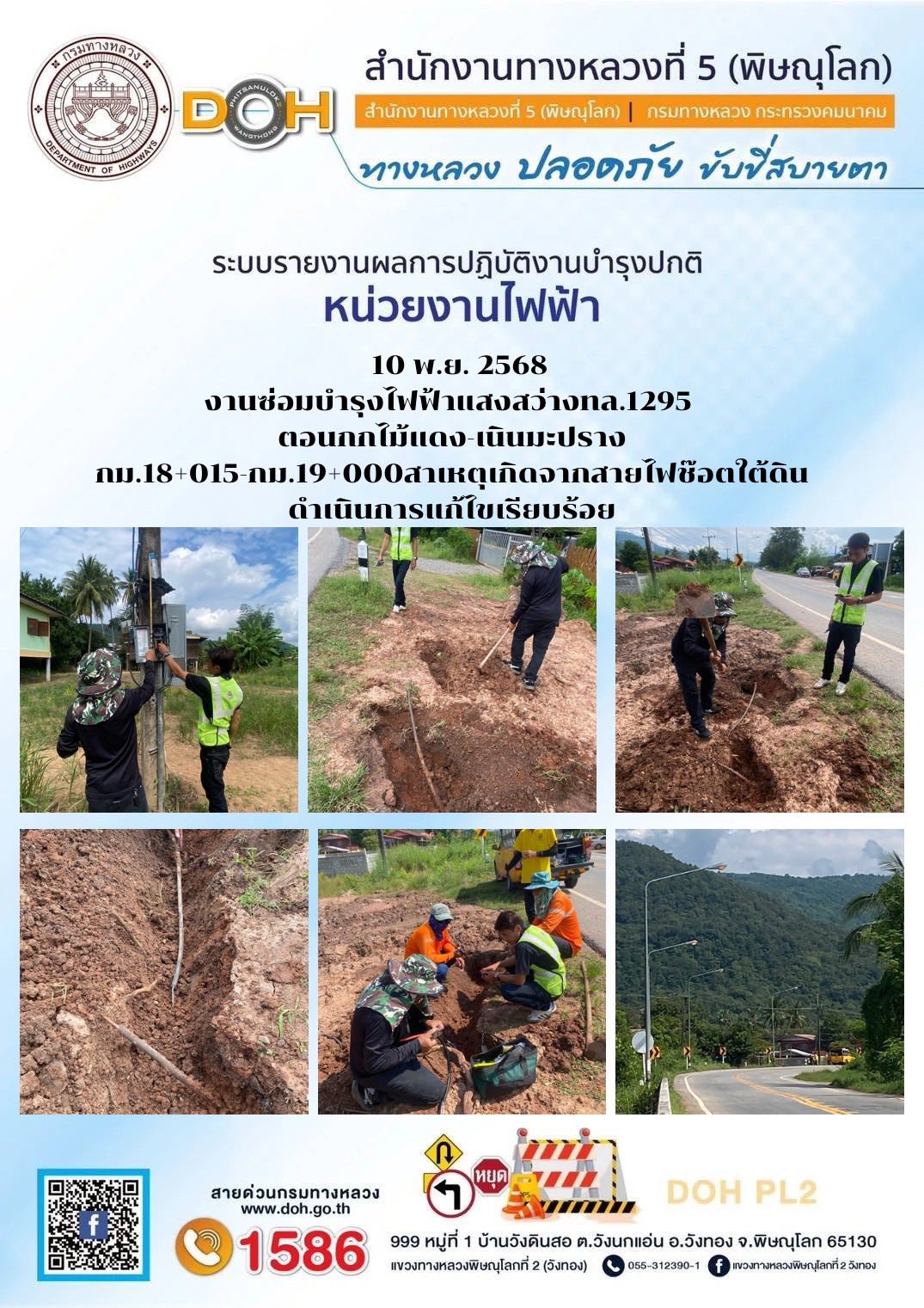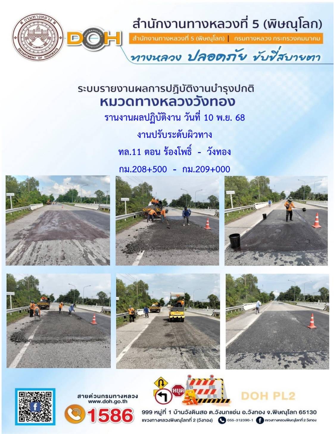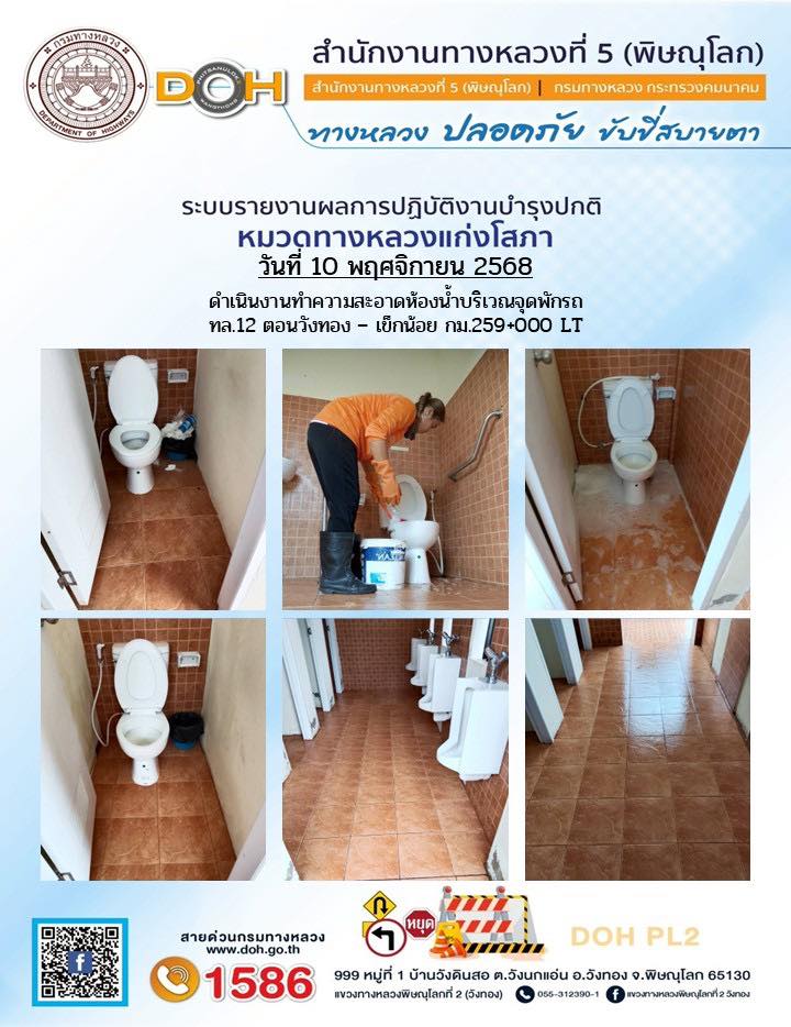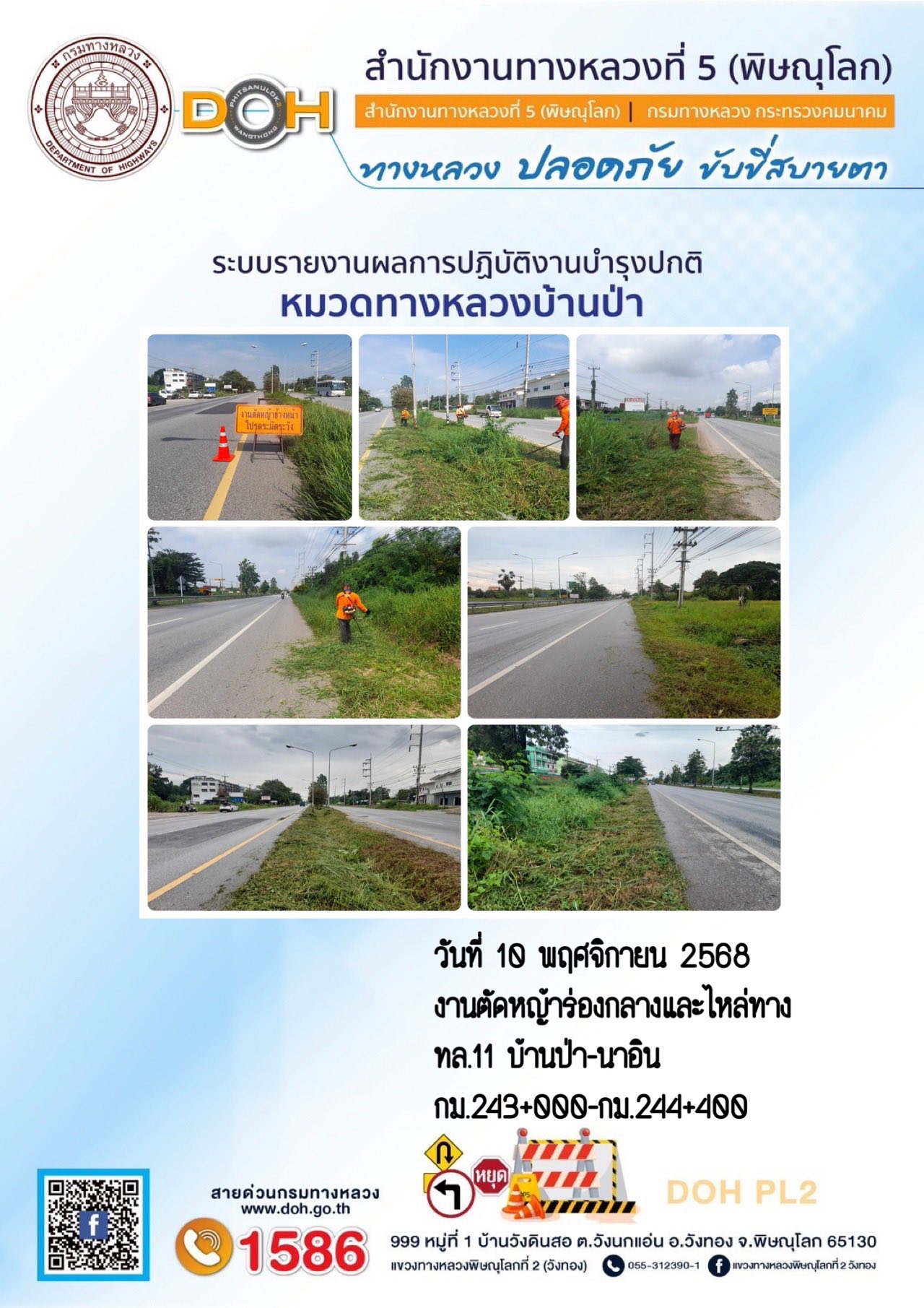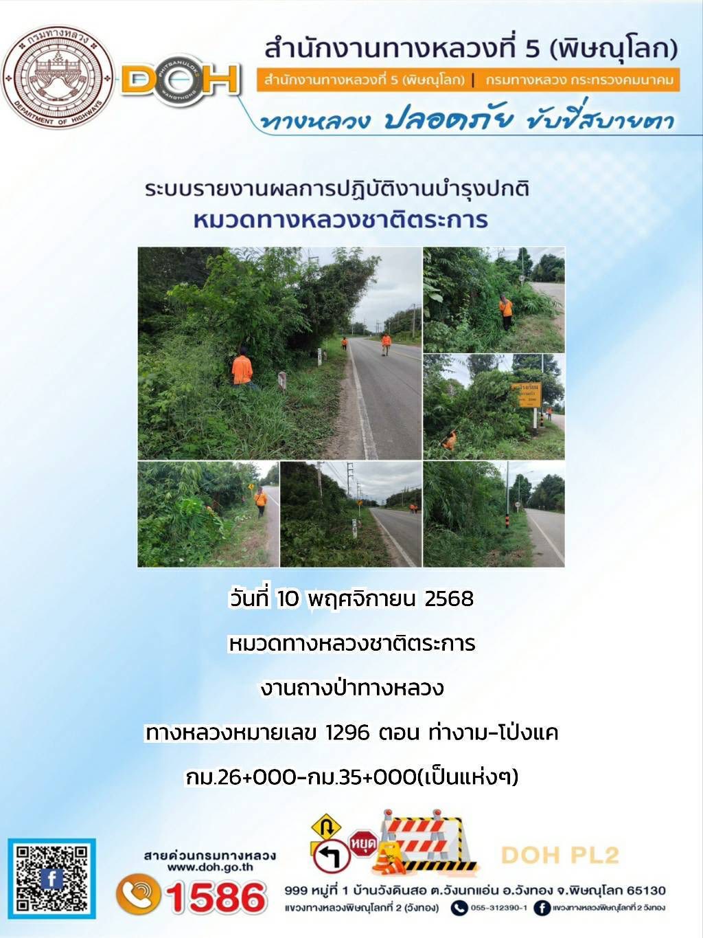 การปฏิบัติงานของ หมวดทางหลวง และ หน่วยงานในสังกัด เพื่ออำนวยความสะดวก และปลอดภัยให้กับประชาชนผู้ใช้เส้นทาง ประจำวันจันทร์ ที่ 10 พฤศจิกายน 2568