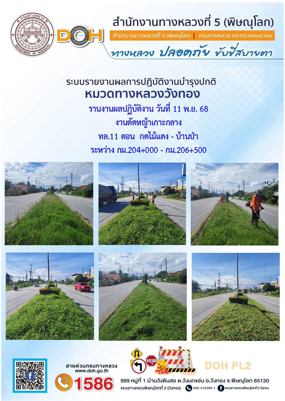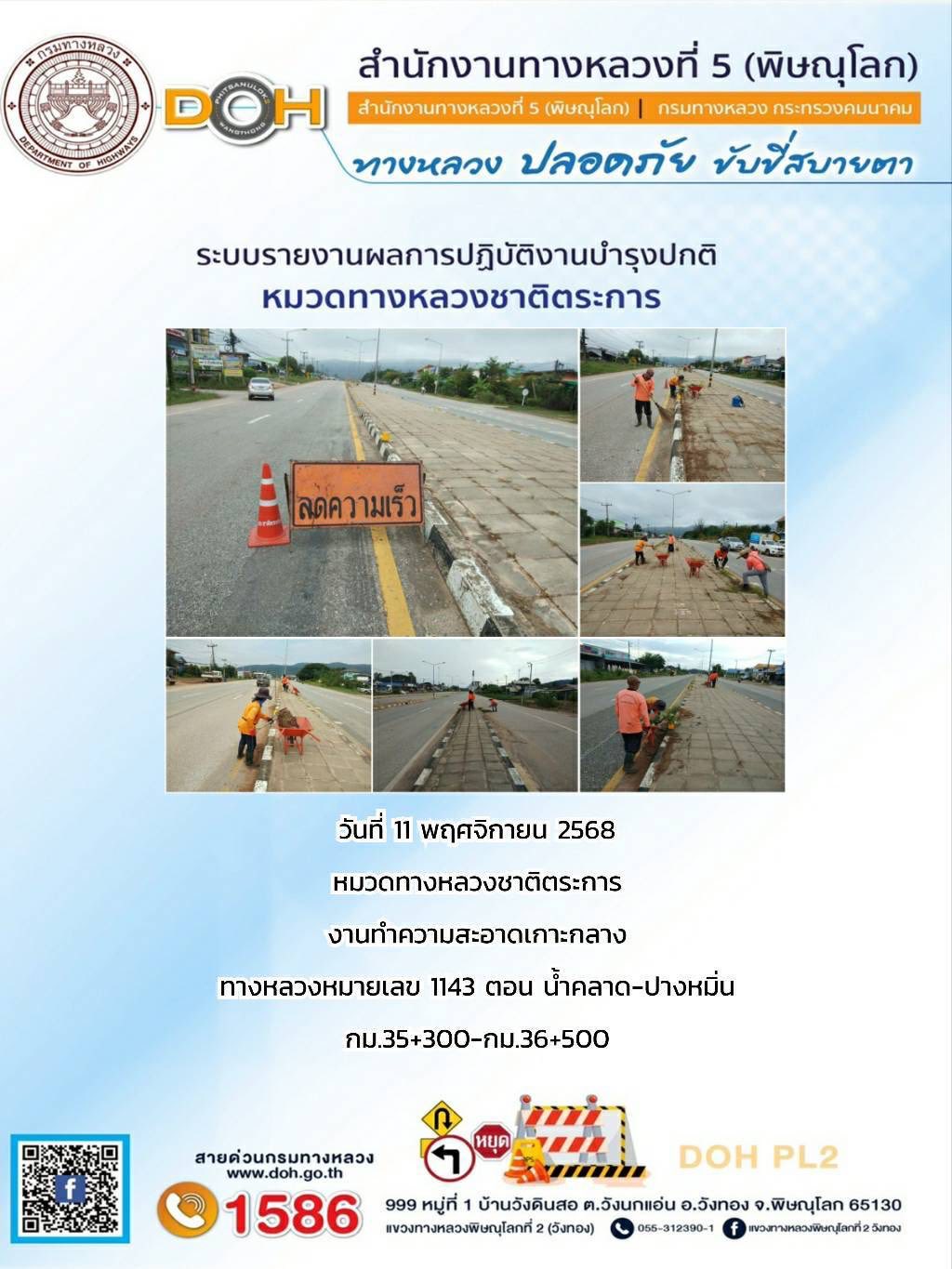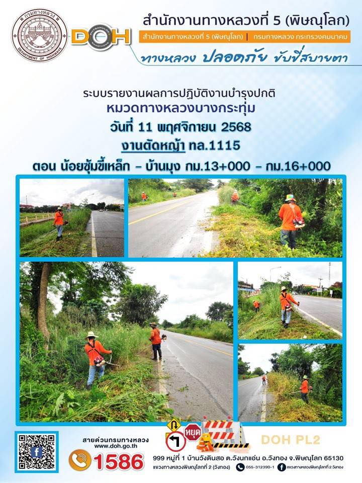 การปฏิบัติงานของ หมวดทางหลวง และ หน่วยงานในสังกัด เพื่ออำนวยความสะดวก และปลอดภัยให้กับประชาชนผู้ใช้เส้นทาง ประจำวันอังคาร ที่ 11 พฤศจิกายน 2568