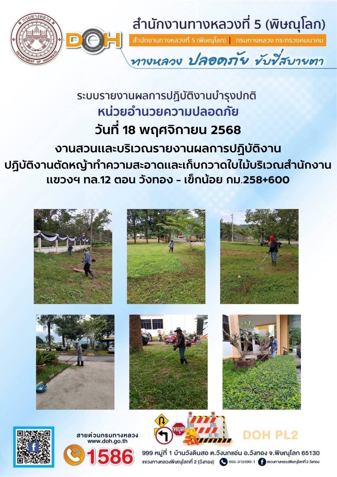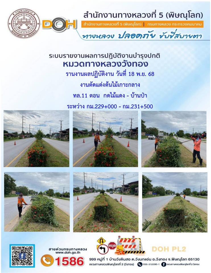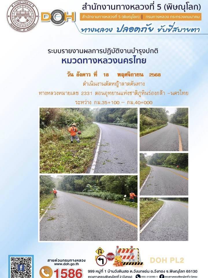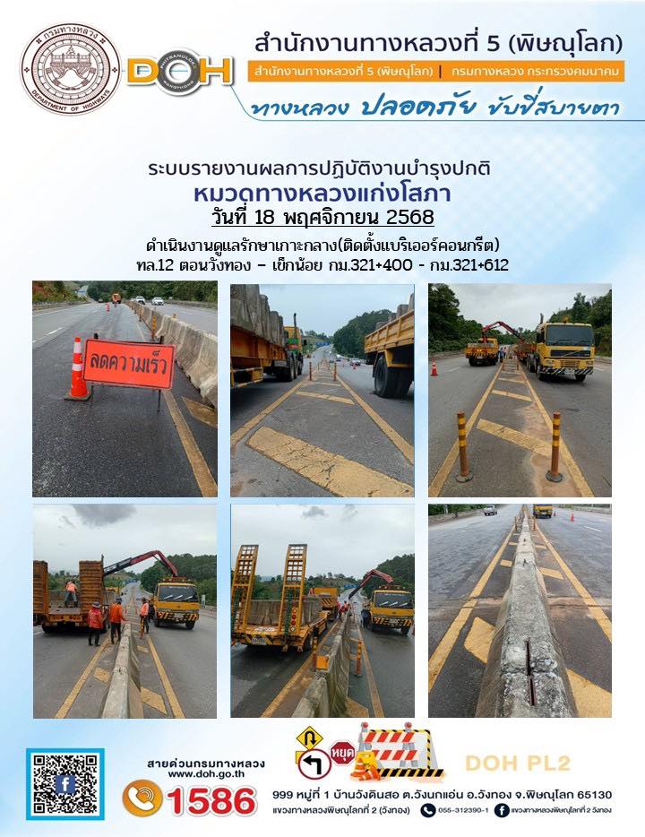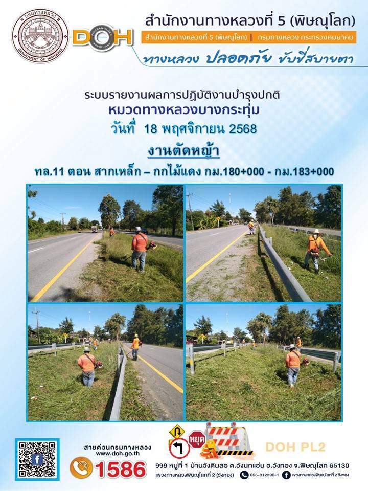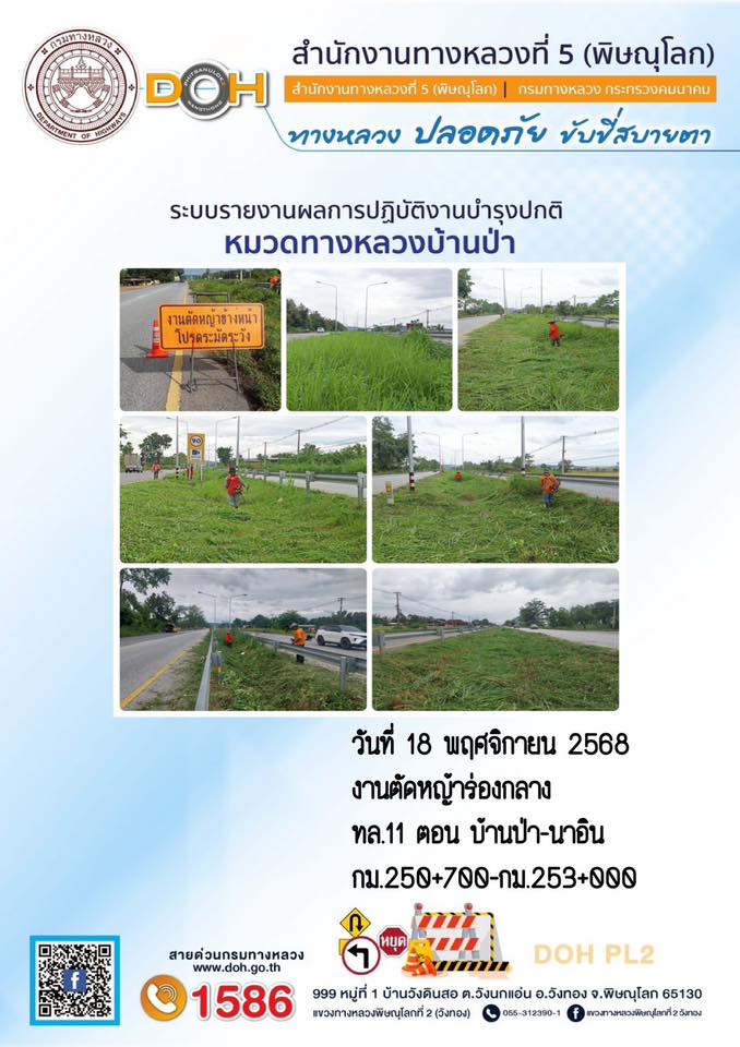 การปฏิบัติงานของ หมวดทางหลวง และ หน่วยงานในสังกัด เพื่ออำนวยความสะดวก และปลอดภัยให้กับประชาชนผู้ใช้เส้นทาง ประจำวันอังคาร ที่ 18 พฤศจิกายน 2568