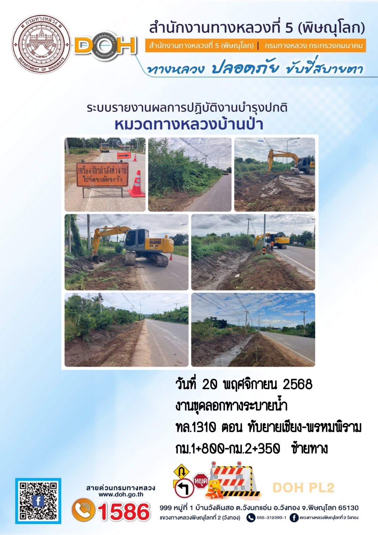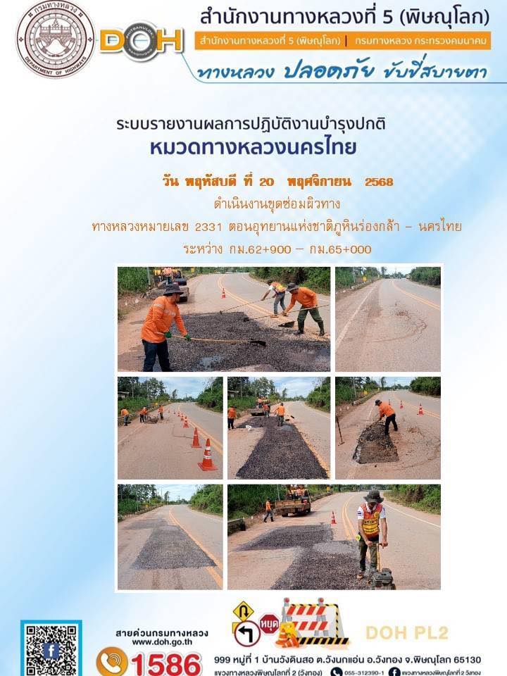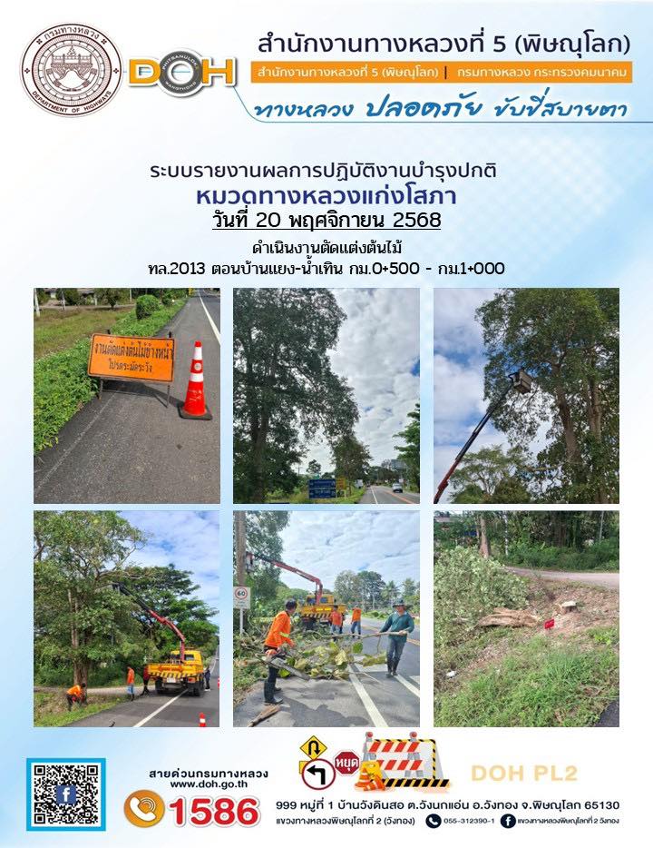 การปฏิบัติงานของ หมวดทางหลวง และ หน่วยงานในสังกัด เพื่ออำนวยความสะดวก และปลอดภัยให้กับประชาชนผู้ใช้เส้นทาง ประจำวันพฤหัสบดี ที่ 20 พฤศจิกายน 2568