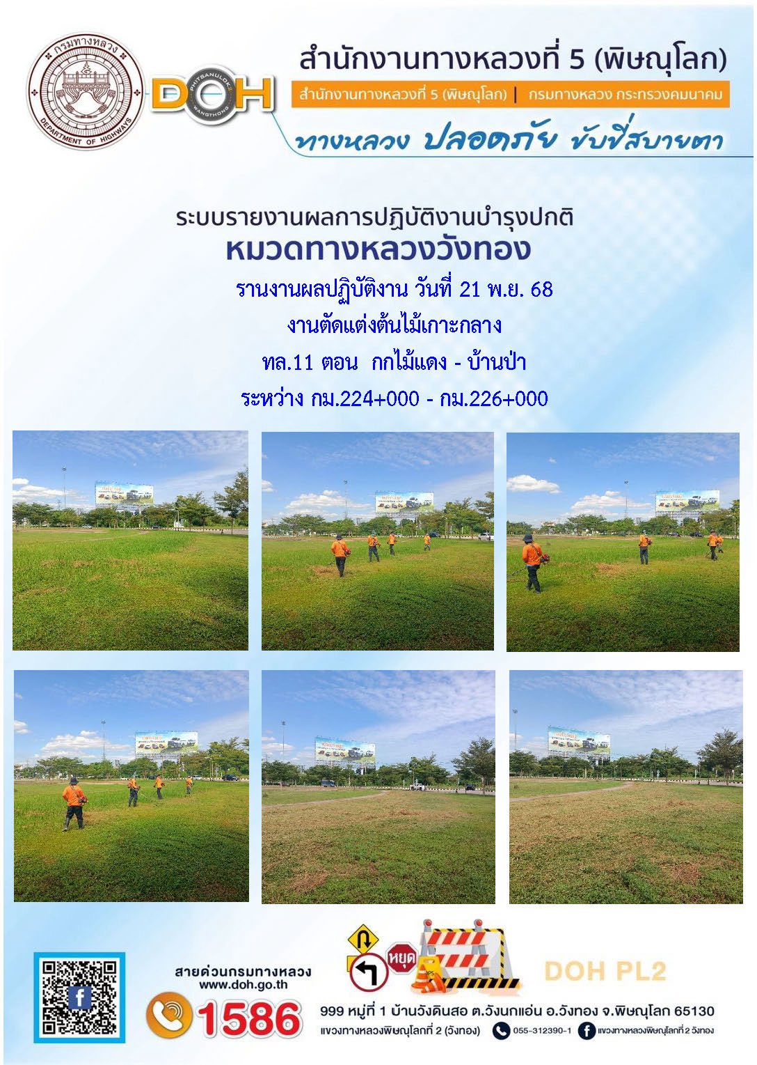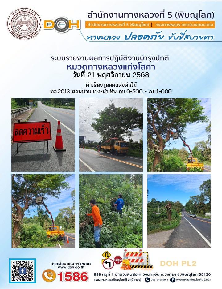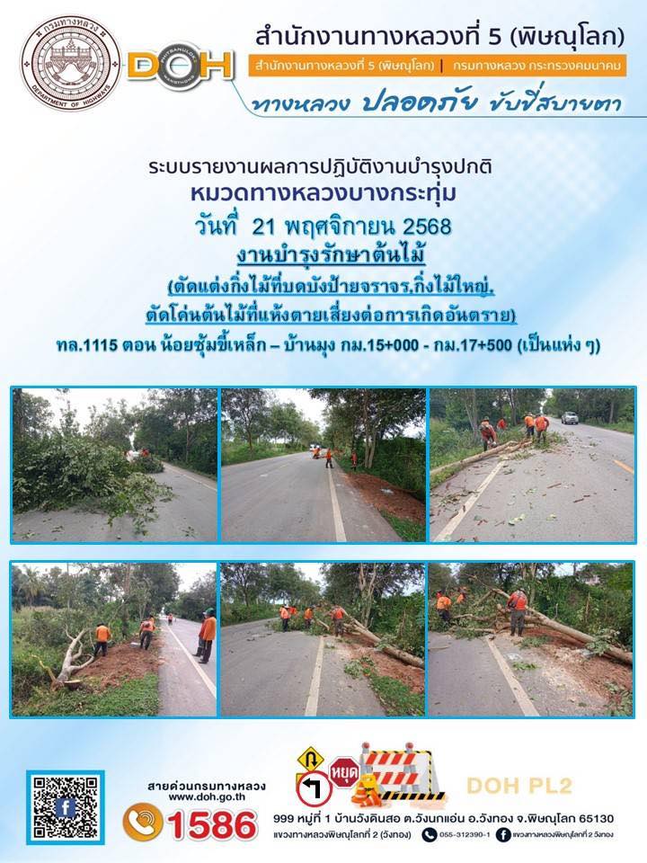 การปฏิบัติงานของ หมวดทางหลวง และ หน่วยงานในสังกัด เพื่ออำนวยความสะดวก และปลอดภัยให้กับประชาชนผู้ใช้เส้นทาง ประจำวันศุกร์ ที่ 21 พฤศจิกายน 2568