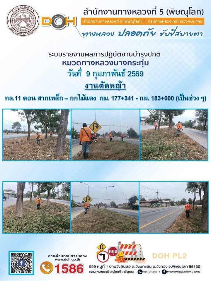 การปฏิบัติงานของ หมวดทางหลวง และ หน่วยงานในสังกัด เพื่ออำนวยความสะดวก และปลอดภัยให้กับประชาชนผู้ใช้เส้นทาง ประจำวันจันทร์ ที่ 9 กุมภาพันธ์ 2569