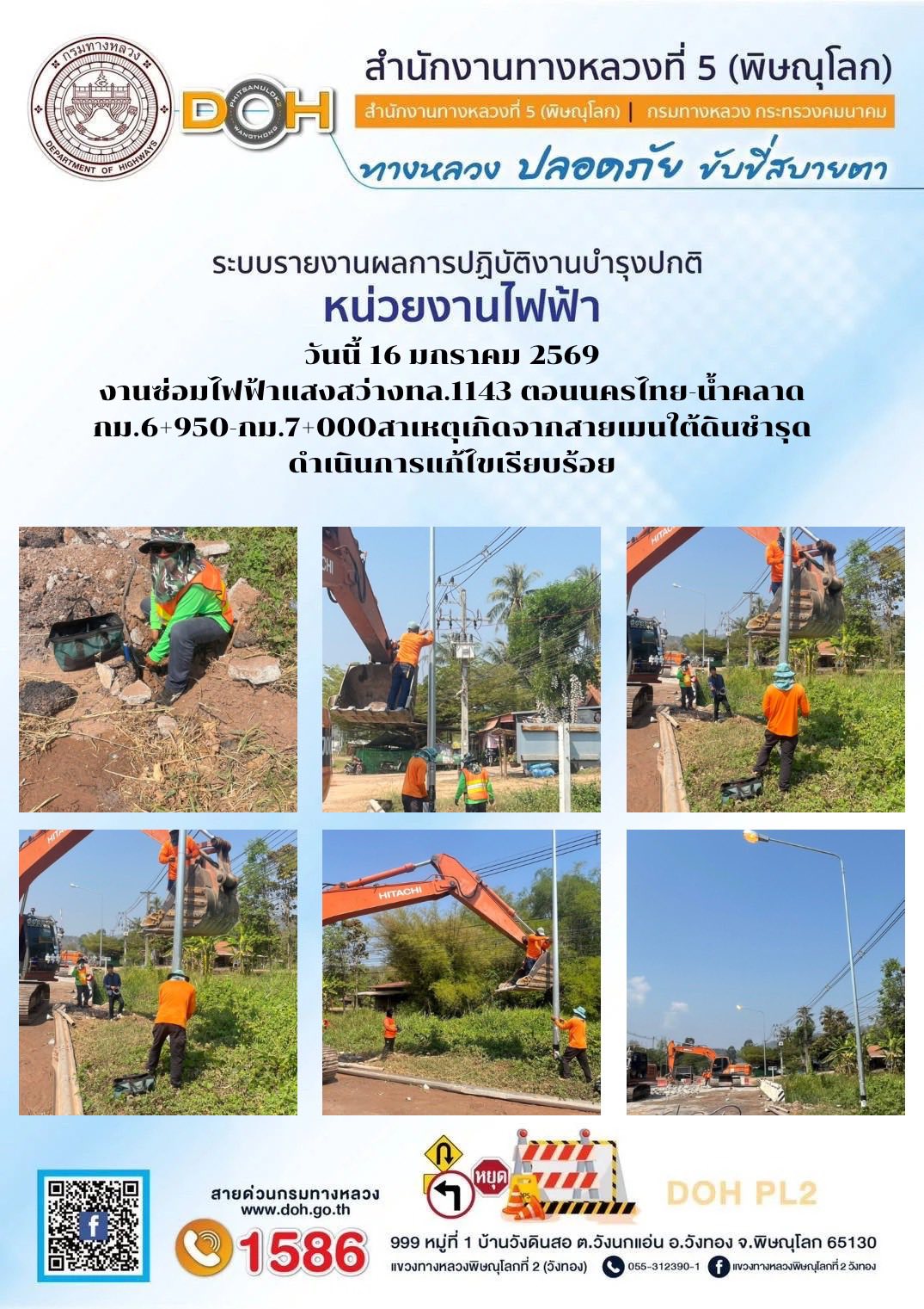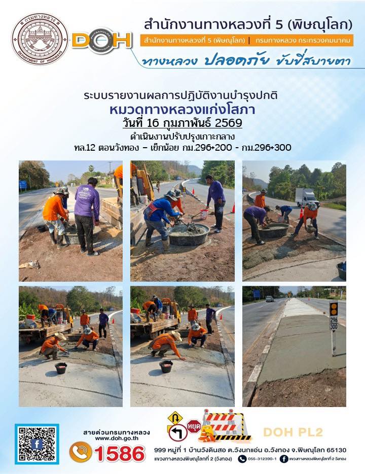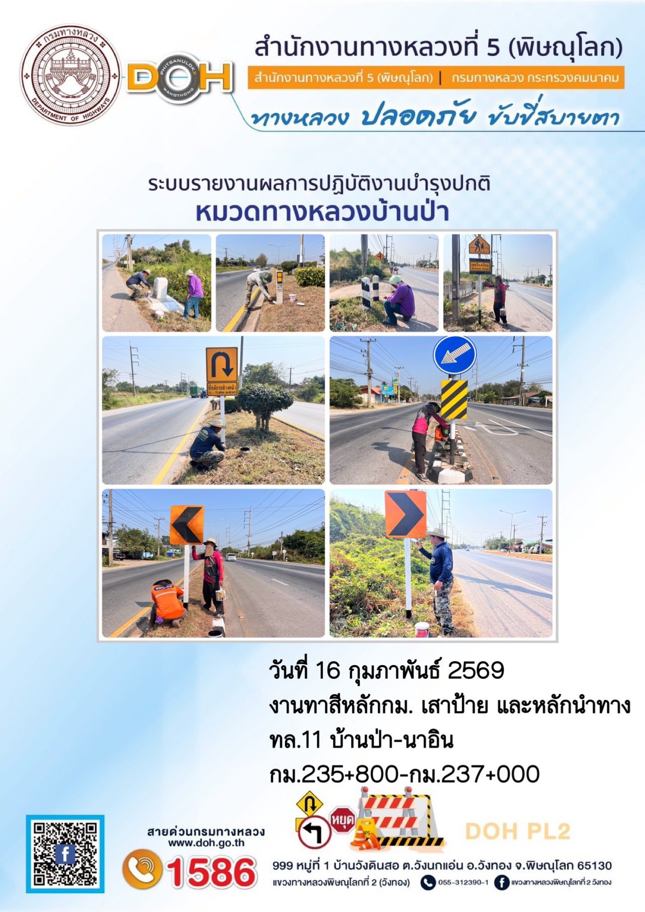 การปฏิบัติงานของ หมวดทางหลวง และ หน่วยงานในสังกัด เพื่ออำนวยความสะดวก และปลอดภัยให้กับประชาชนผู้ใช้เส้นทาง ประจำวันจันทร์ ที่ 16 กุมภาพันธ์ 2569