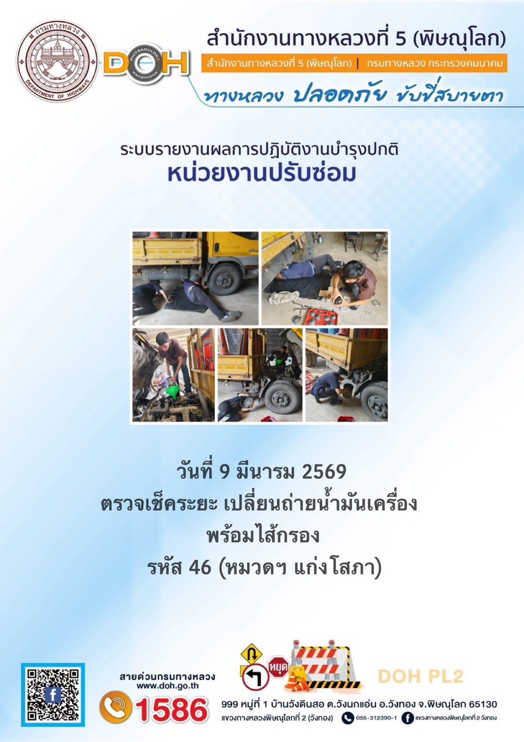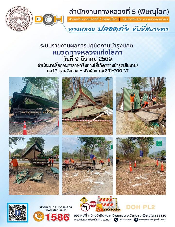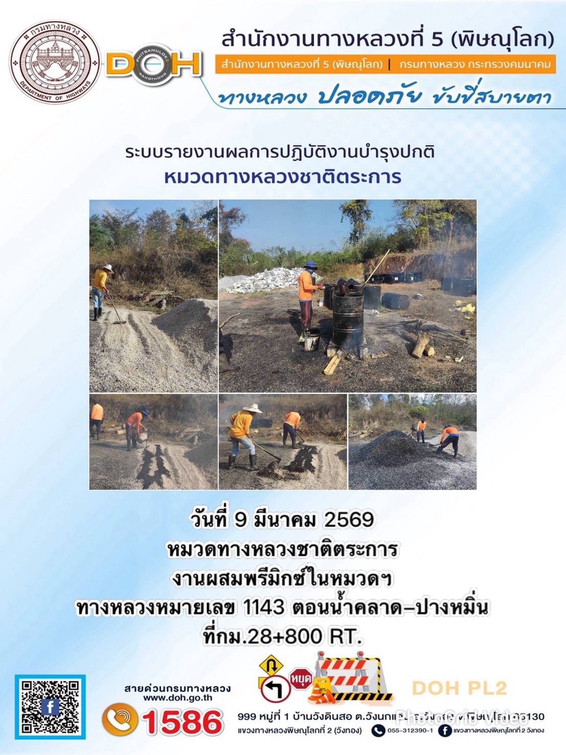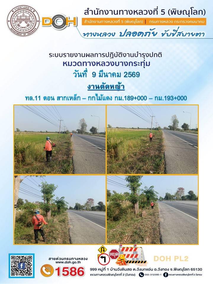 การปฏิบัติงานของ หมวดทางหลวง และ หน่วยงานในสังกัด เพื่ออำนวยความสะดวก และปลอดภัยให้กับประชาชนผู้ใช้เส้นทาง ประจำวันจันทร์ ที่ 9 กุมภาพันธ์ 2569