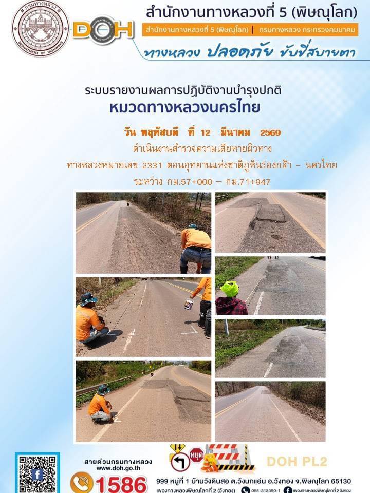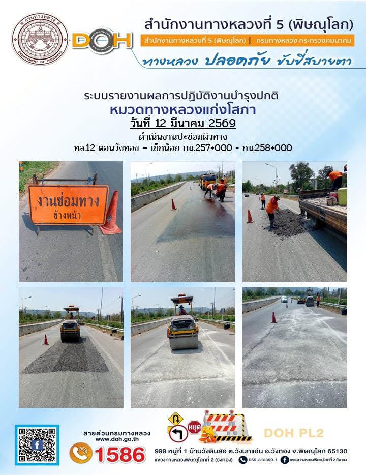 การปฏิบัติงานของ หมวดทางหลวง และ หน่วยงานในสังกัด เพื่ออำนวยความสะดวก และปลอดภัยให้กับประชาชนผู้ใช้เส้นทาง ประจำวันพฤหัสบดี ที่ 12 กุมภาพันธ์ 2569