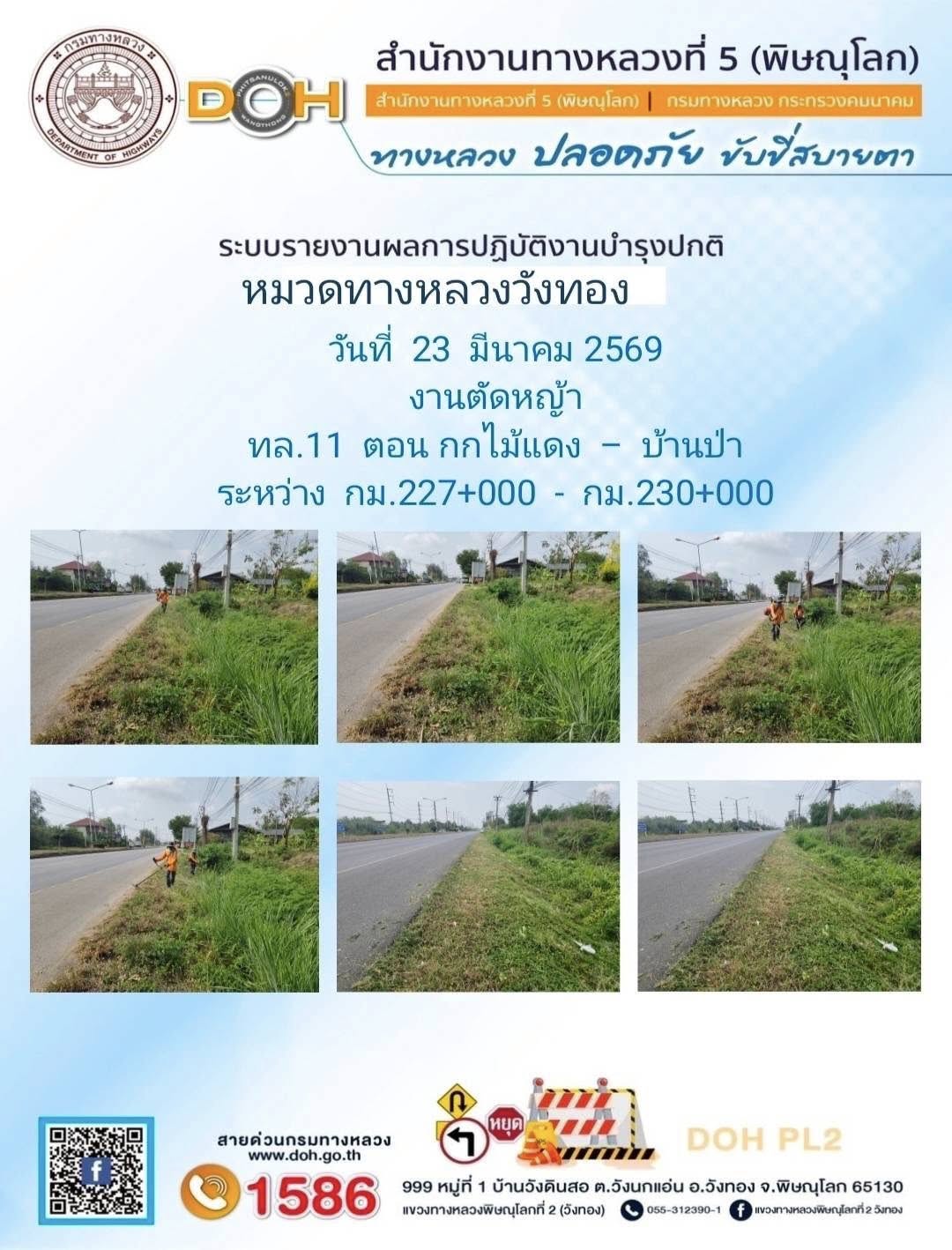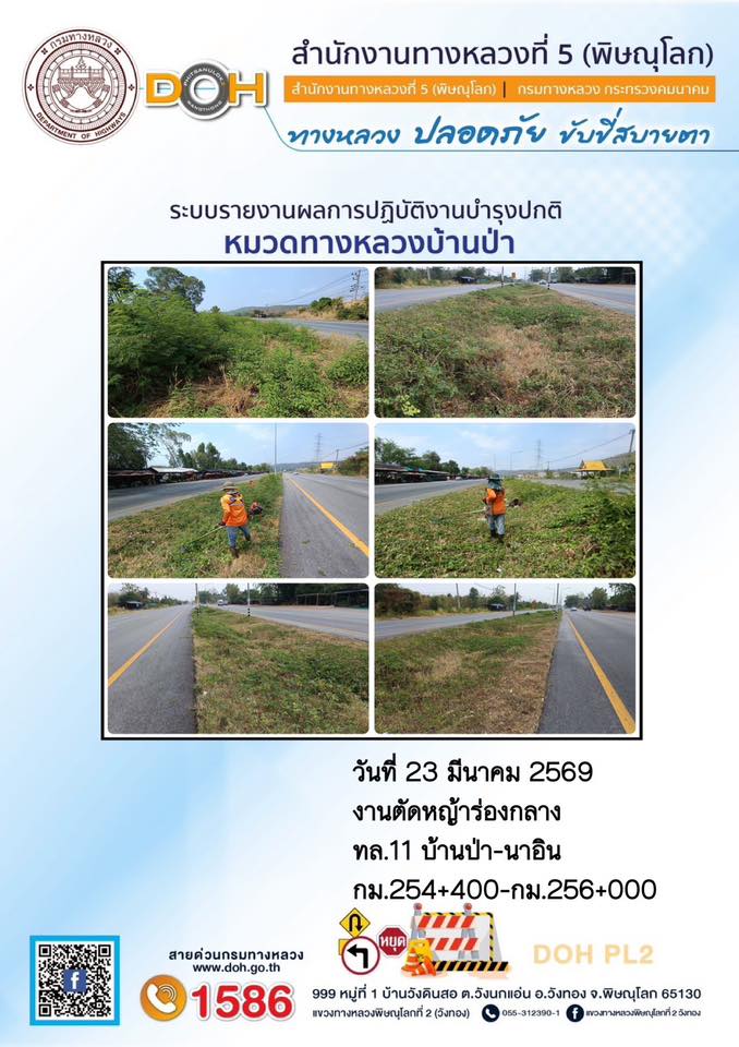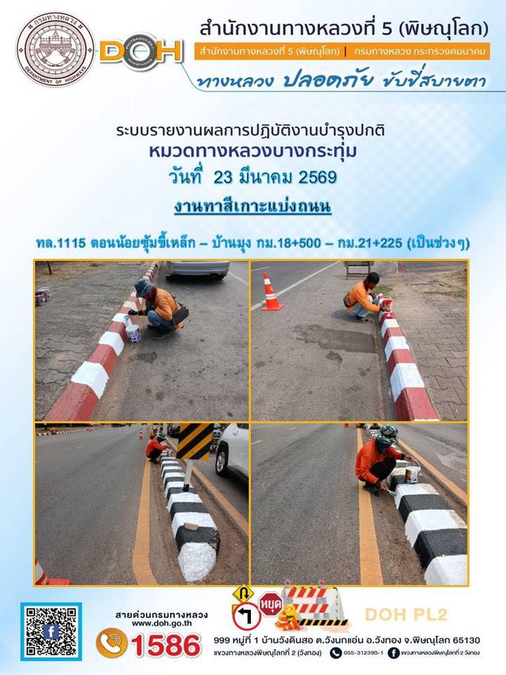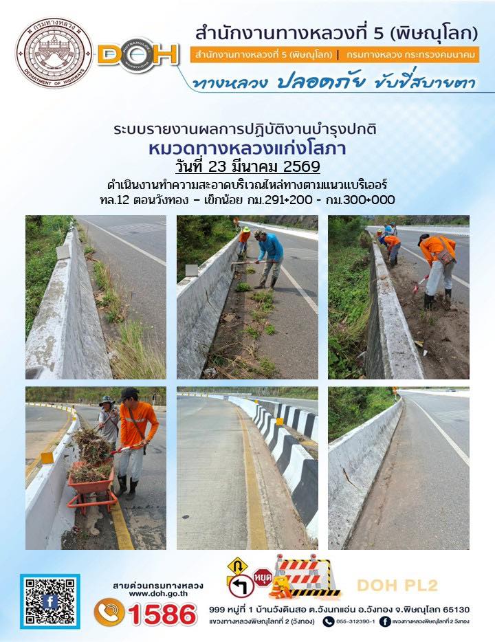 การปฏิบัติงานของ หมวดทางหลวง และ หน่วยงานในสังกัด เพื่ออำนวยความสะดวก และปลอดภัยให้กับประชาชนผู้ใช้เส้นทาง ประจำวันจันทร์ ที่ 23 มีนาคม 2569