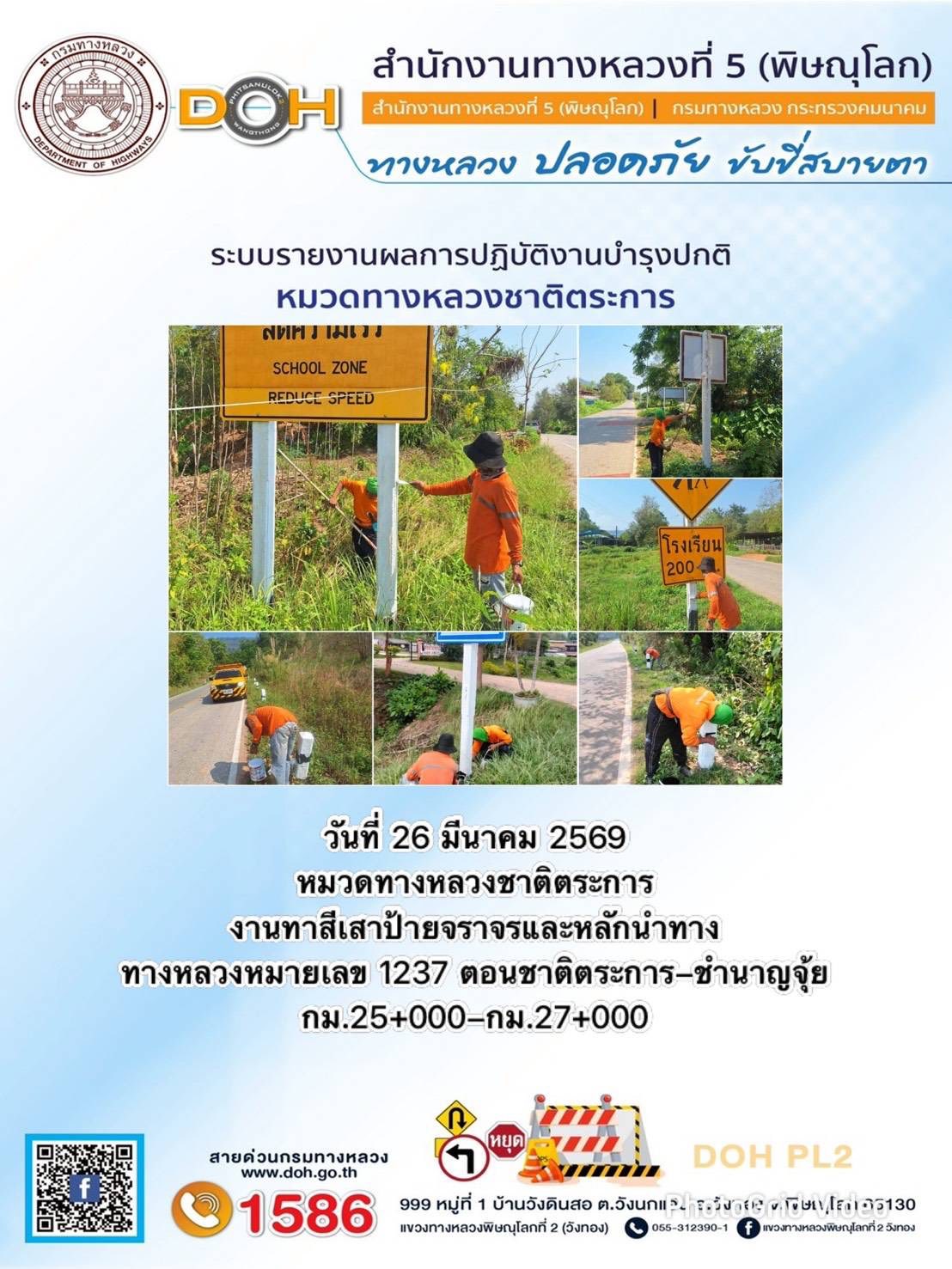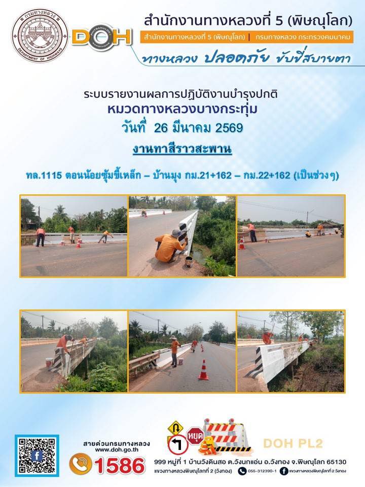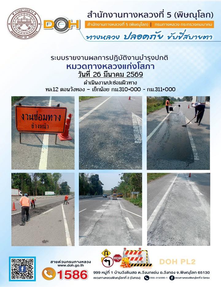 การปฏิบัติงานของ หมวดทางหลวง และ หน่วยงานในสังกัด เพื่ออำนวยความสะดวก และปลอดภัยให้กับประชาชนผู้ใช้เส้นทาง ประจำวันพฤหัสบดี ที่ 26 มีนาคม 2569