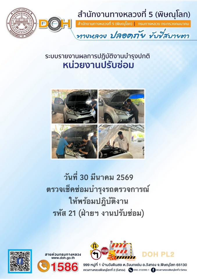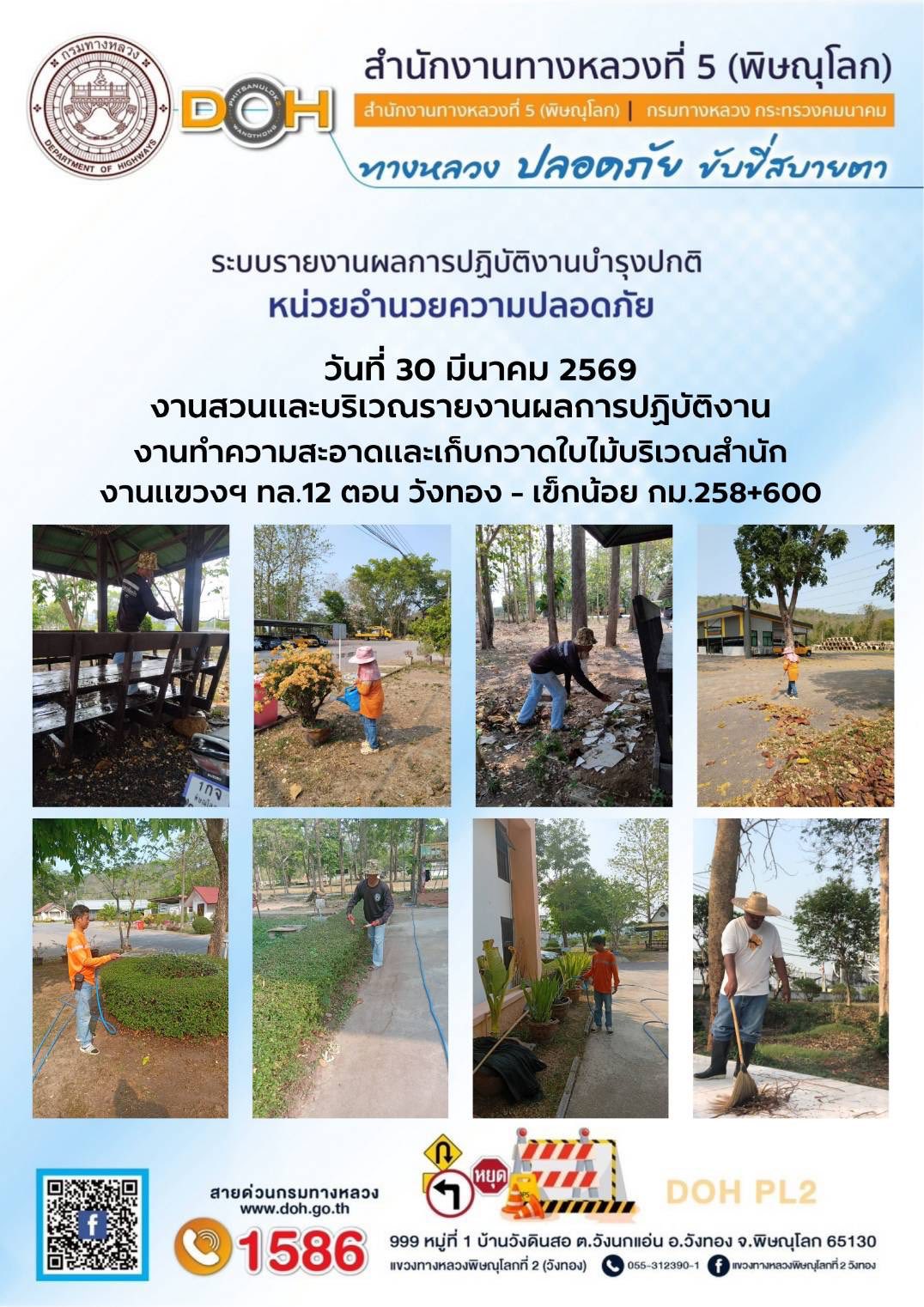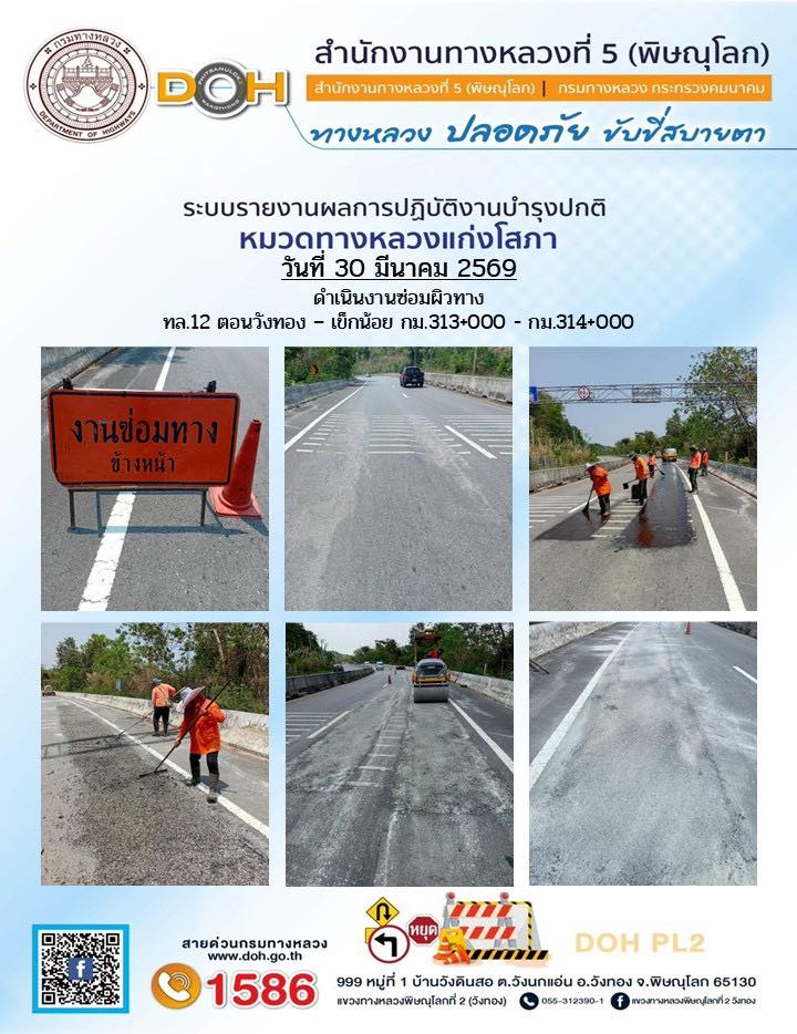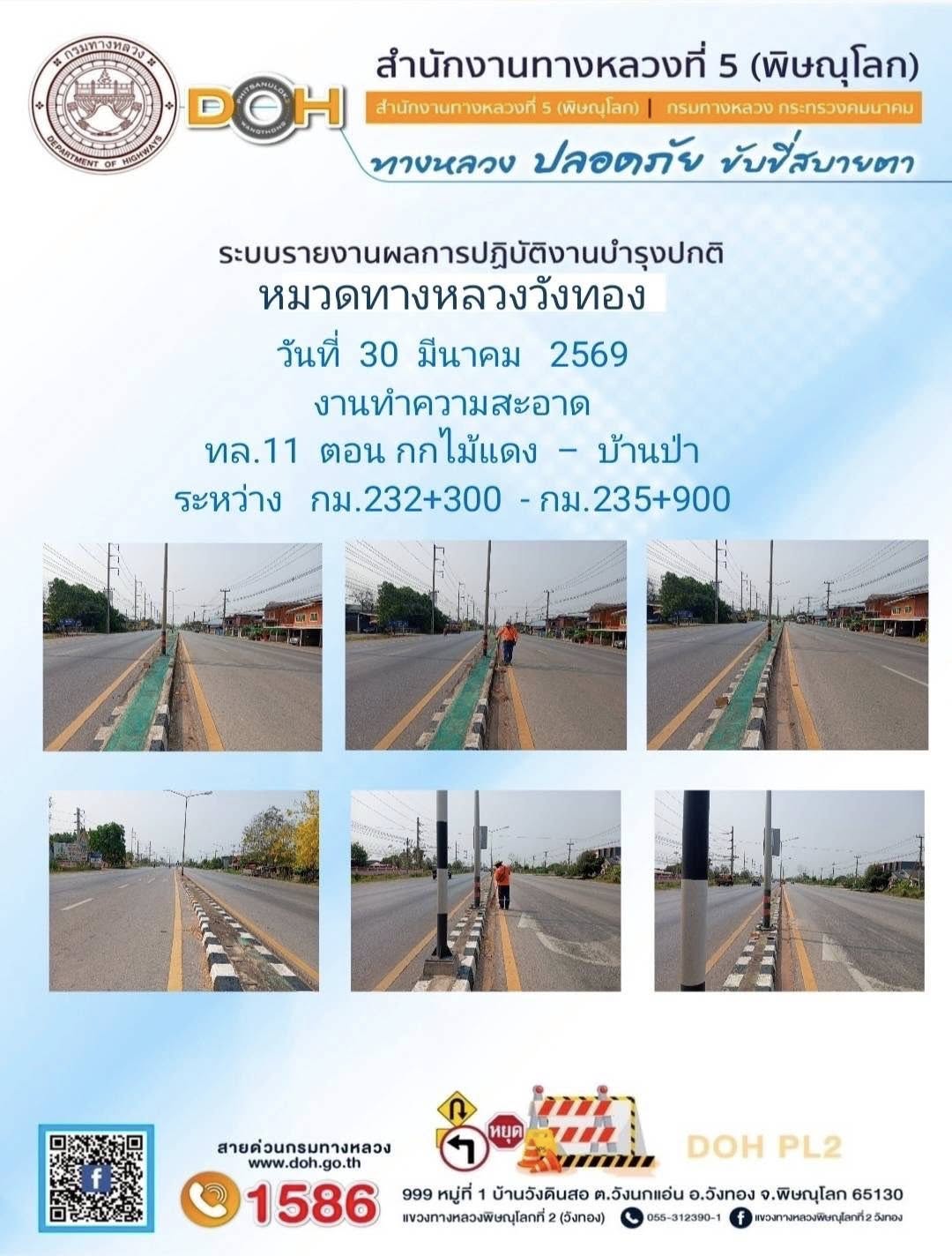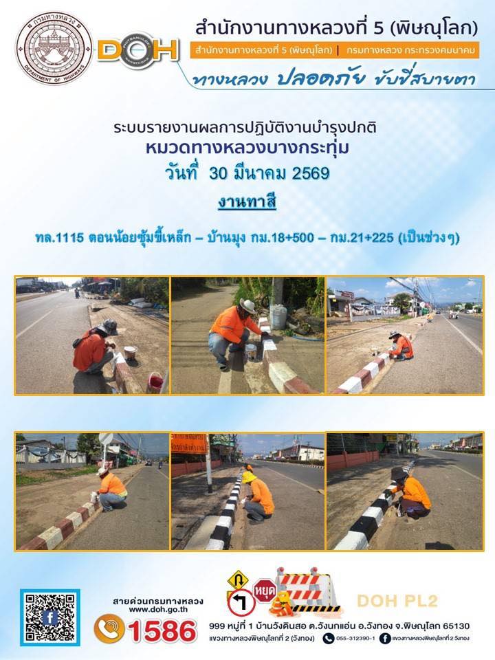 การปฏิบัติงานของ หมวดทางหลวง และ หน่วยงานในสังกัด เพื่ออำนวยความสะดวก และปลอดภัยให้กับประชาชนผู้ใช้เส้นทาง ประจำวันจันทร์ ที่ 30 มีนาคม 2569