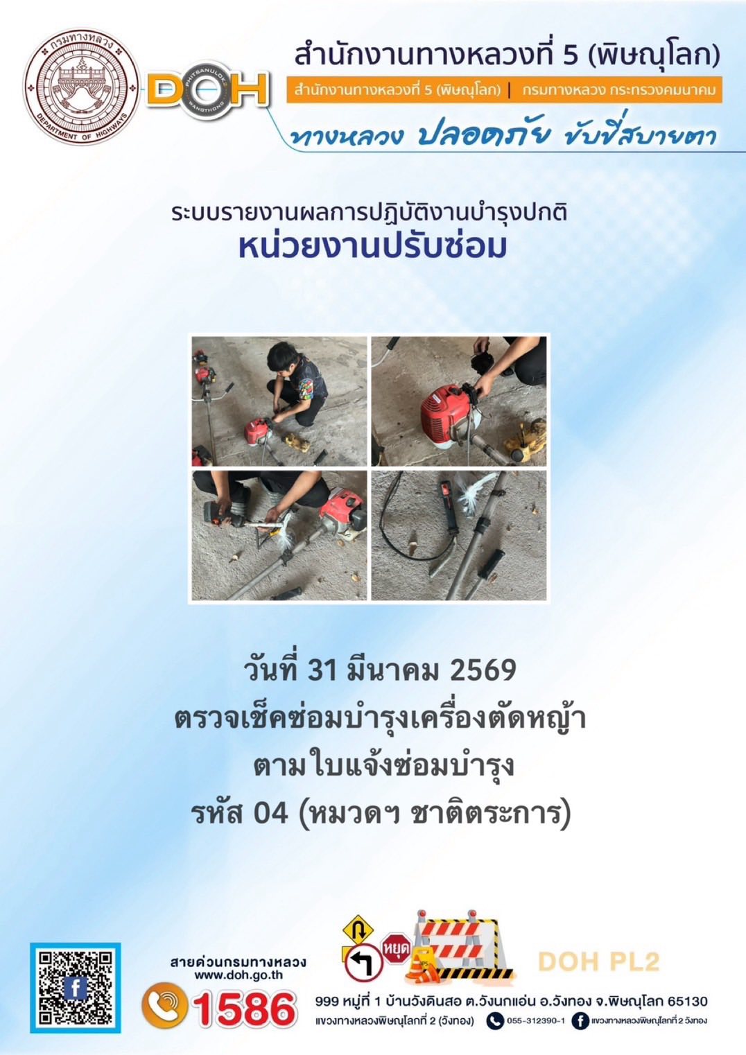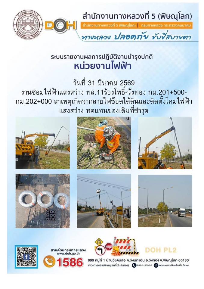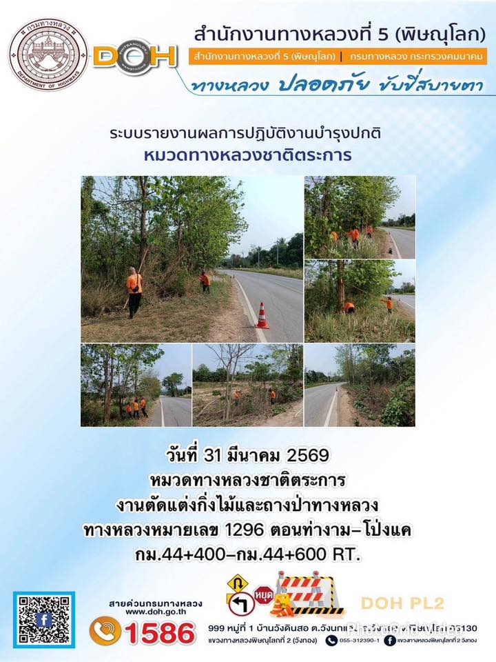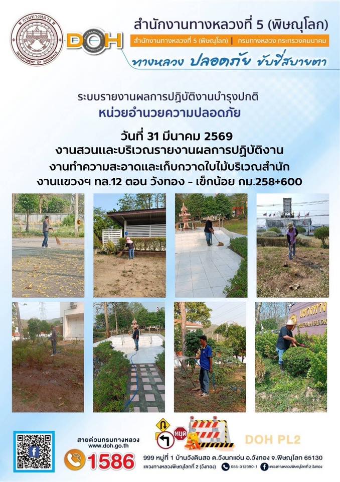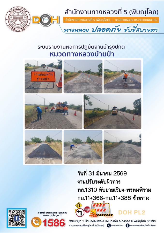 การปฏิบัติงานของ หมวดทางหลวง และ หน่วยงานในสังกัด เพื่ออำนวยความสะดวก และปลอดภัยให้กับประชาชนผู้ใช้เส้นทาง ประจำวันอังคาร ที่ 31 มีนาคม 2569