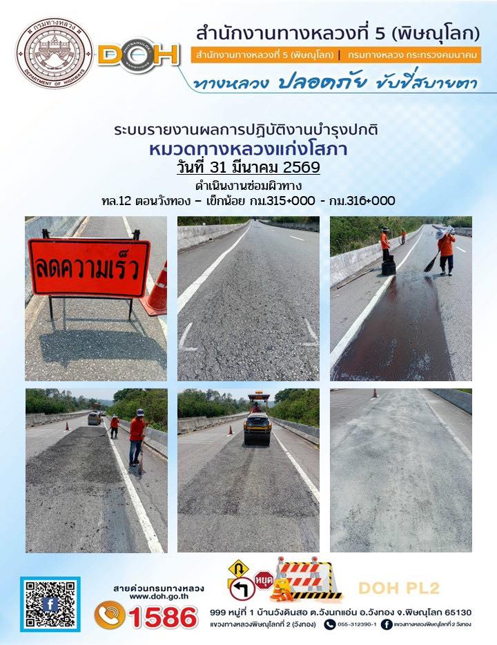 ข้อมูลข่าว : การปฏิบัติงานของ หมวดทางหลวง และ หน่วยงานในสังกัด เพื่ออำนวยความสะดวก และปลอดภัยให้กับประชาชนผู้ใช้เส้นทาง ประจำวันอังคาร ที่ 31 มีนาคม 2569 ?? กรมทางหลวง