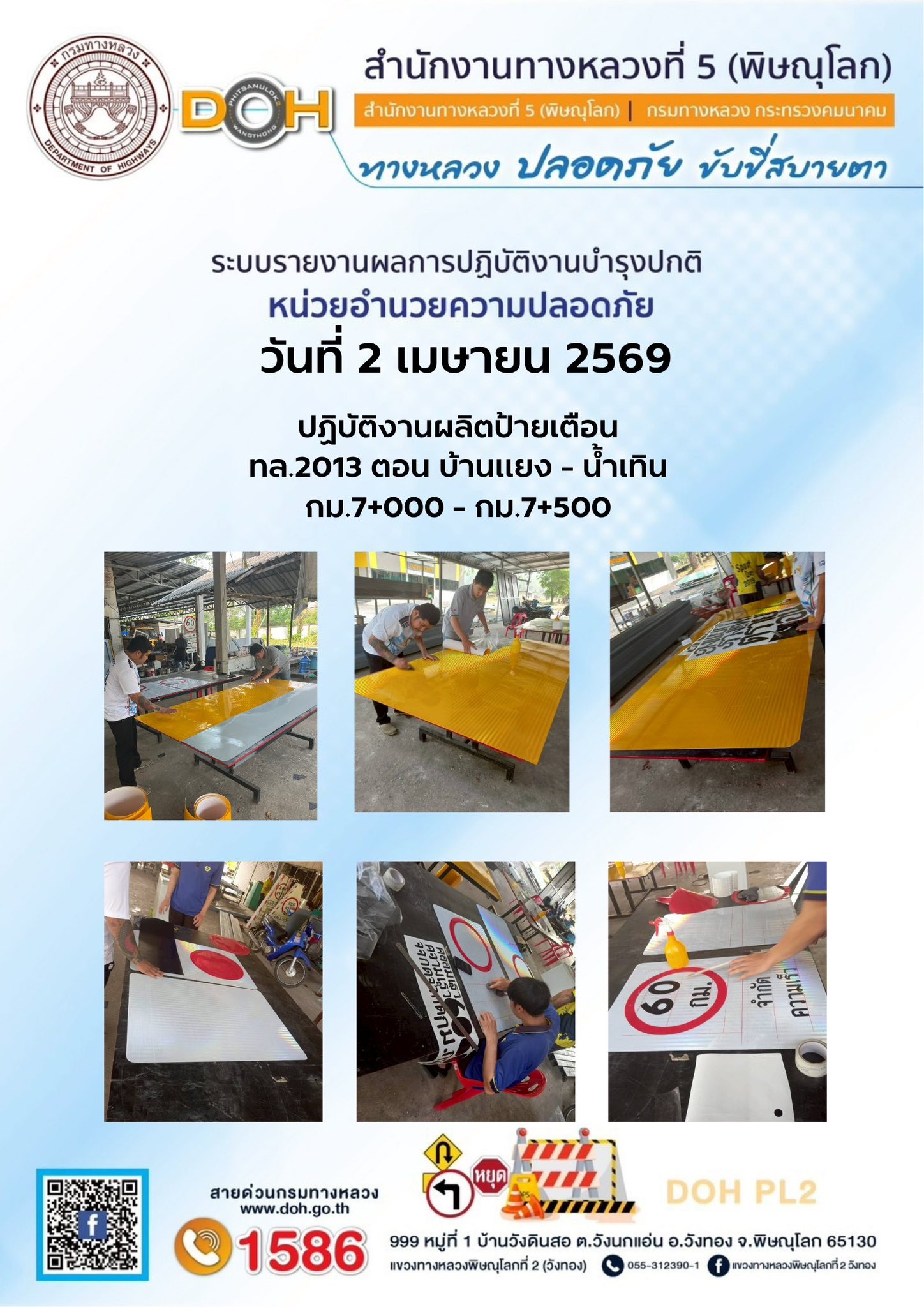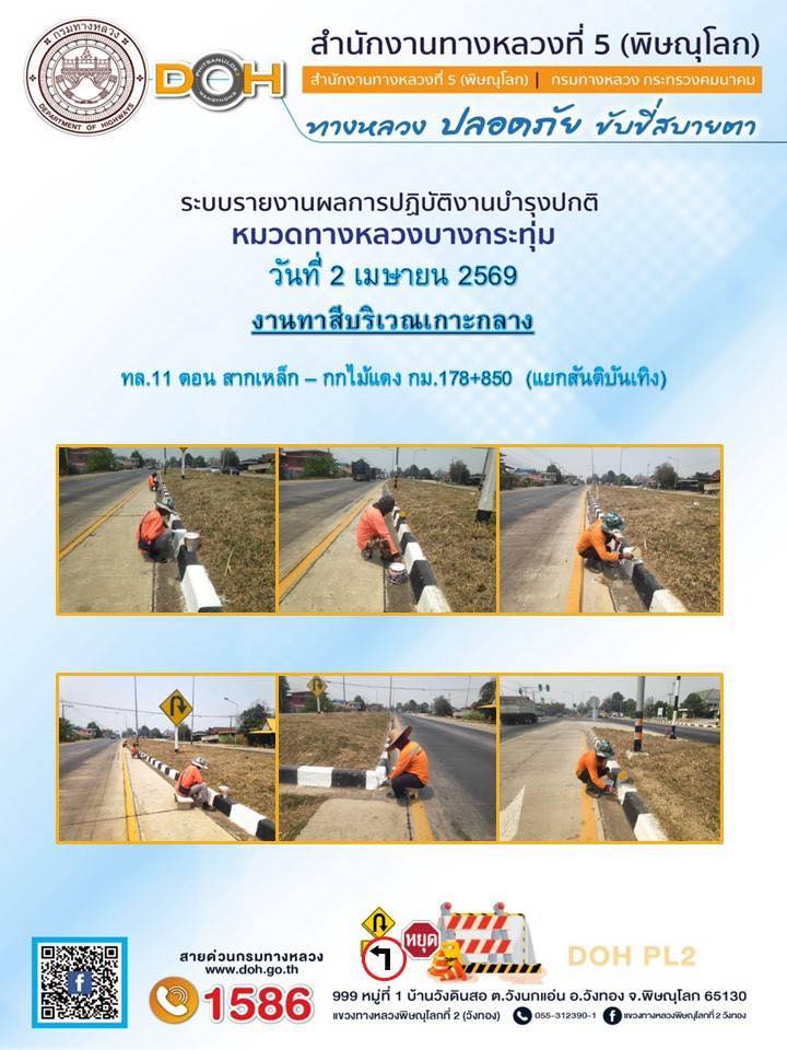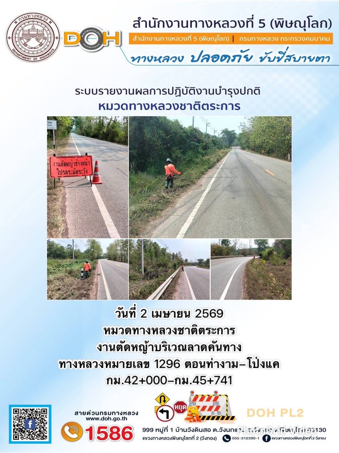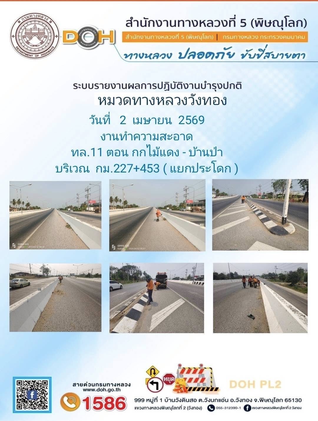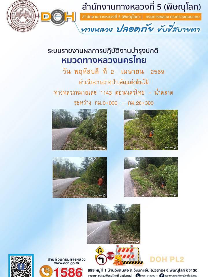 การปฏิบัติงานของ หมวดทางหลวง และ หน่วยงานในสังกัด เพื่ออำนวยความสะดวก และปลอดภัยให้กับประชาชนผู้ใช้เส้นทาง ประจำวันพฤหัสบดี ที่ 2 เมษายน 2569