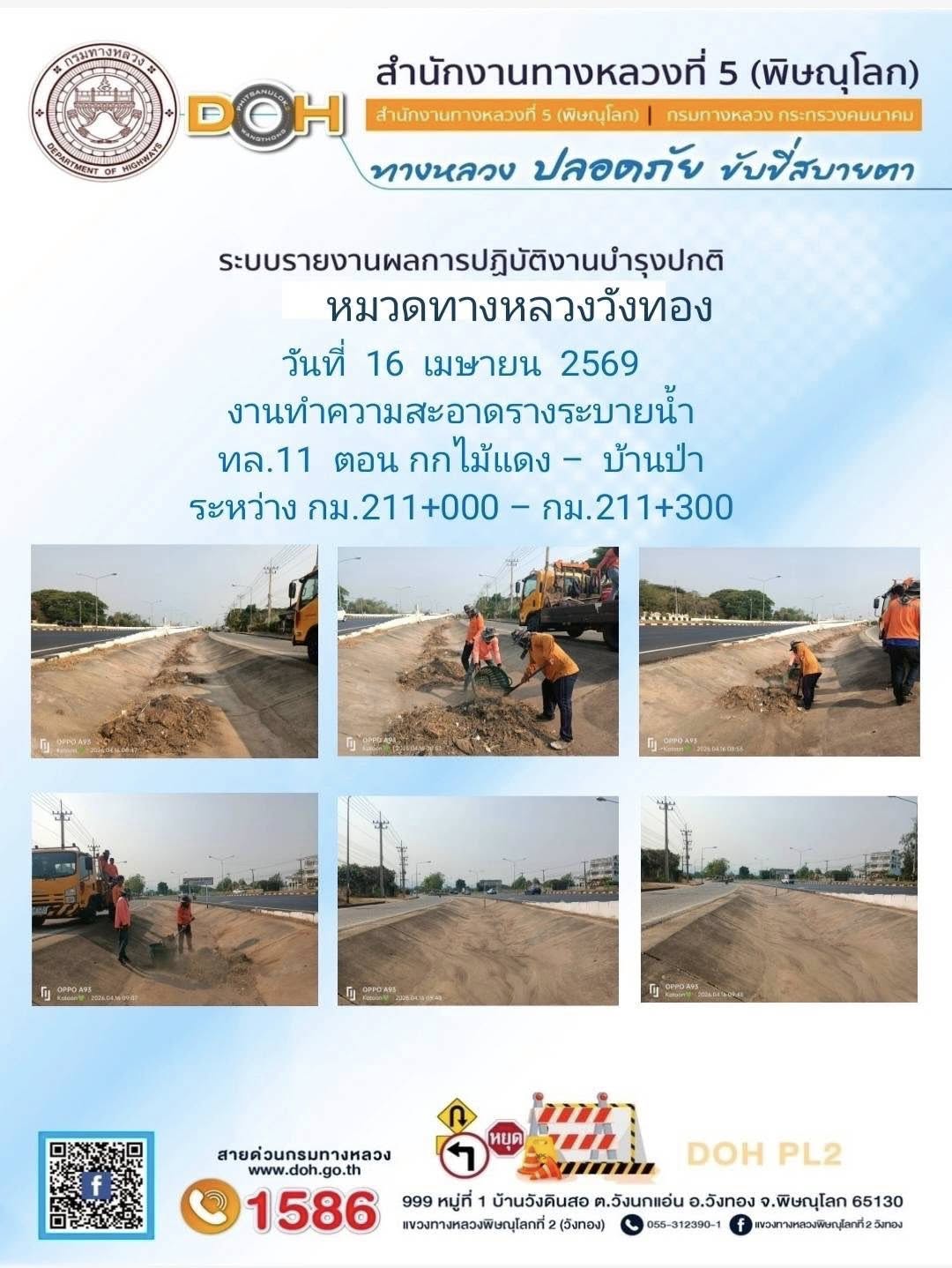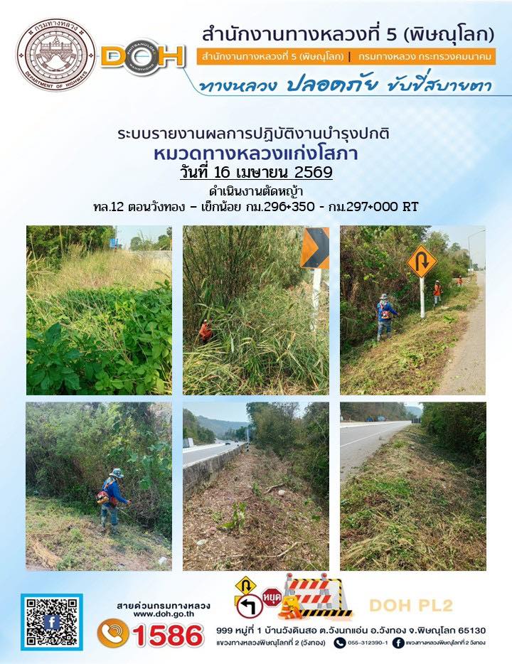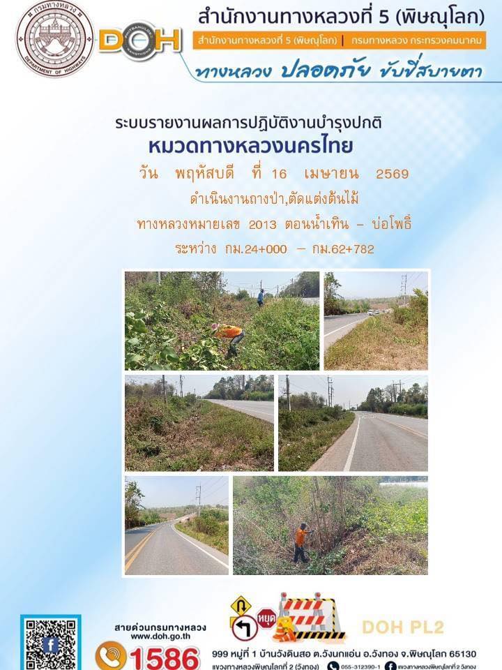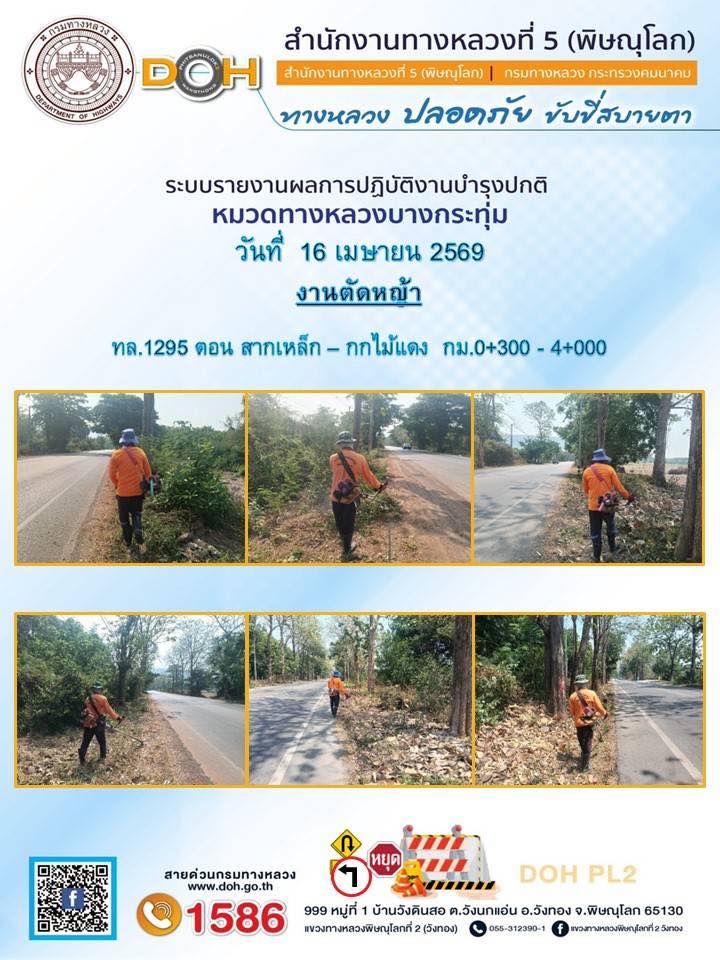 การปฏิบัติงานของ หมวดทางหลวง และ หน่วยงานในสังกัด เพื่ออำนวยความสะดวก และปลอดภัยให้กับประชาชนผู้ใช้เส้นทาง ประจำวันพฤหัสบดี ที่ 16 เมษายน 2569