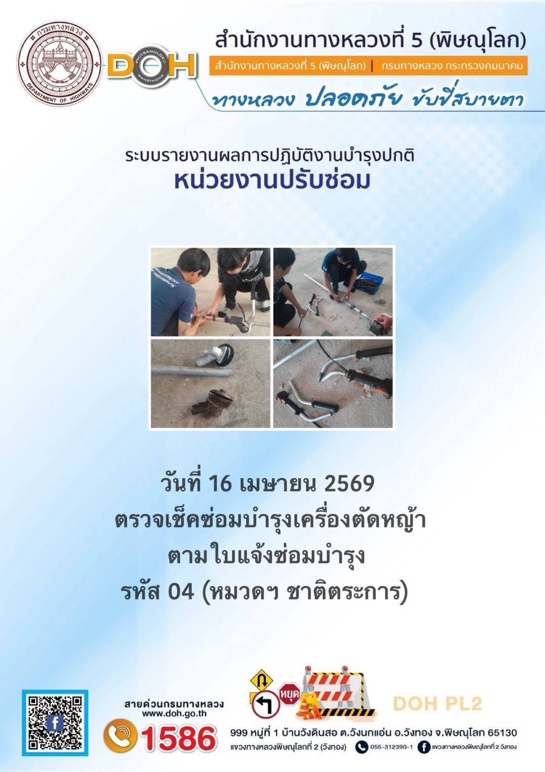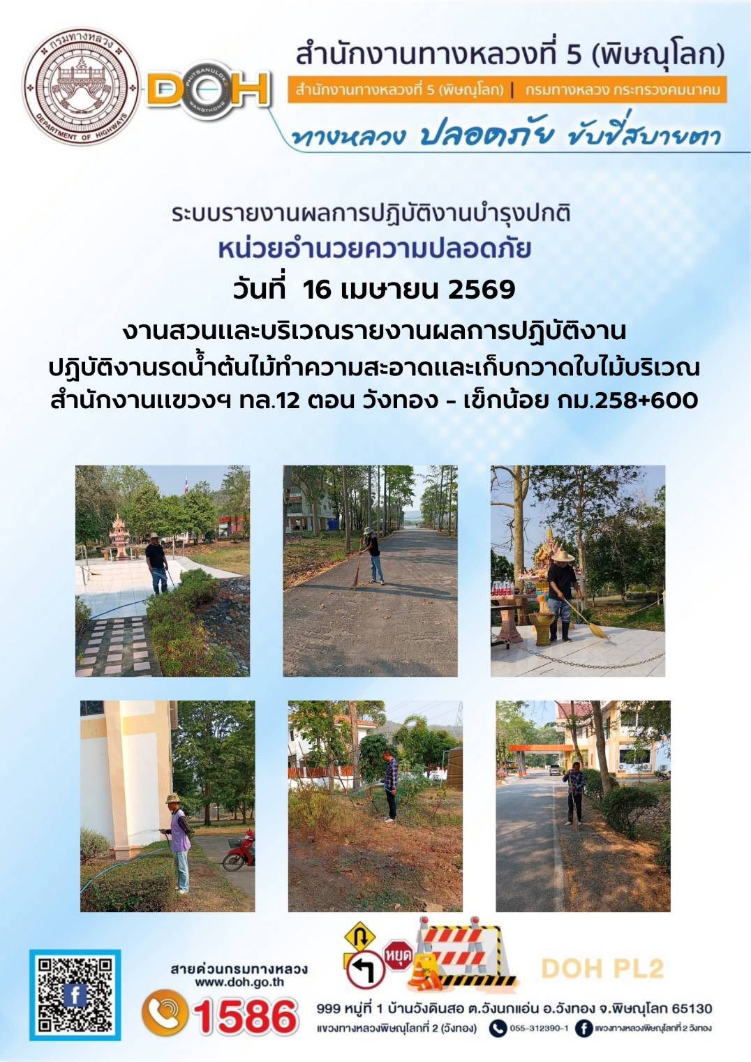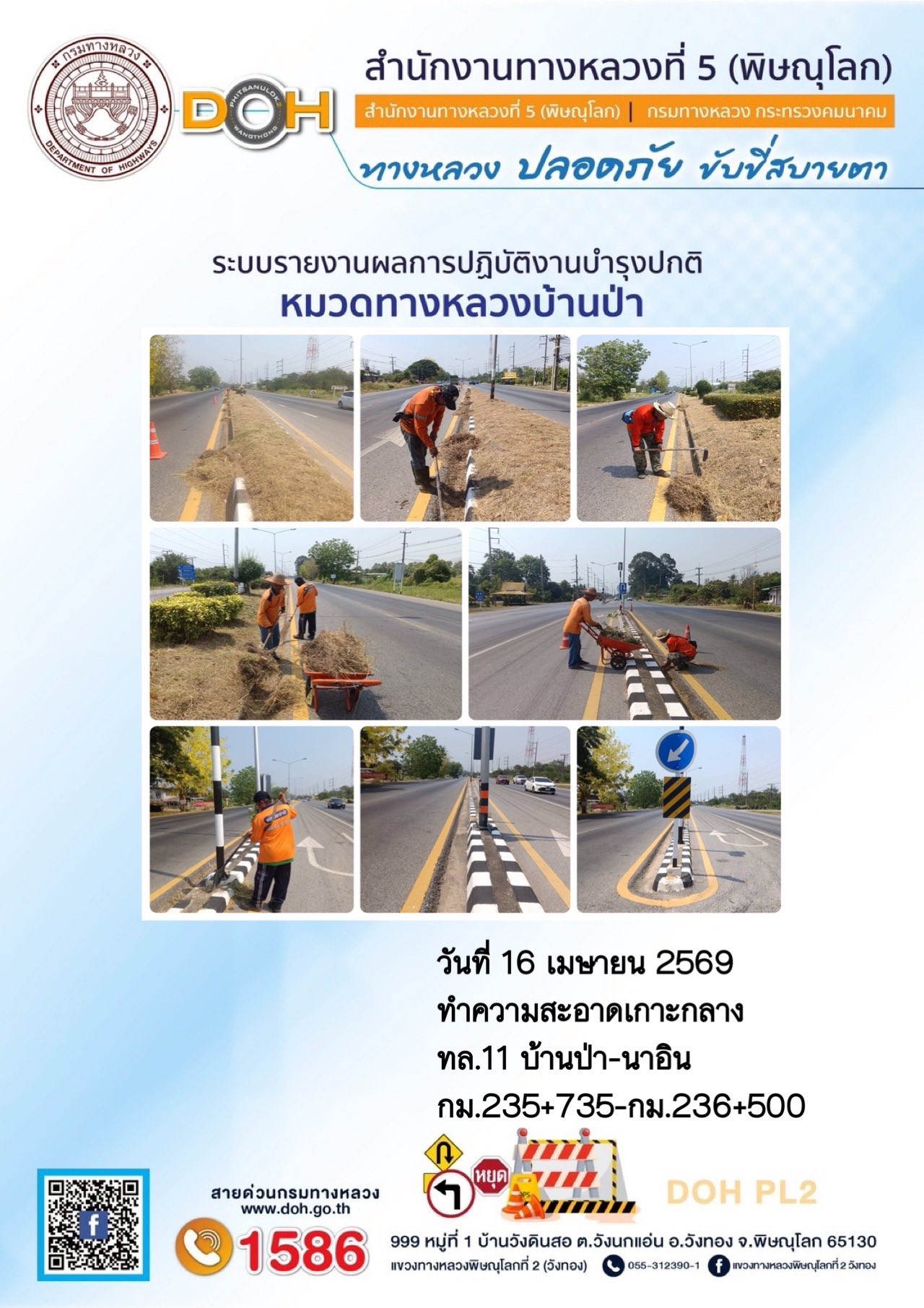 การปฏิบัติงานของ หมวดทางหลวง และ หน่วยงานในสังกัด เพื่ออำนวยความสะดวก และปลอดภัยให้กับประชาชนผู้ใช้เส้นทาง ประจำวันพฤหัสบดี ที่ 16 เมษายน 2569