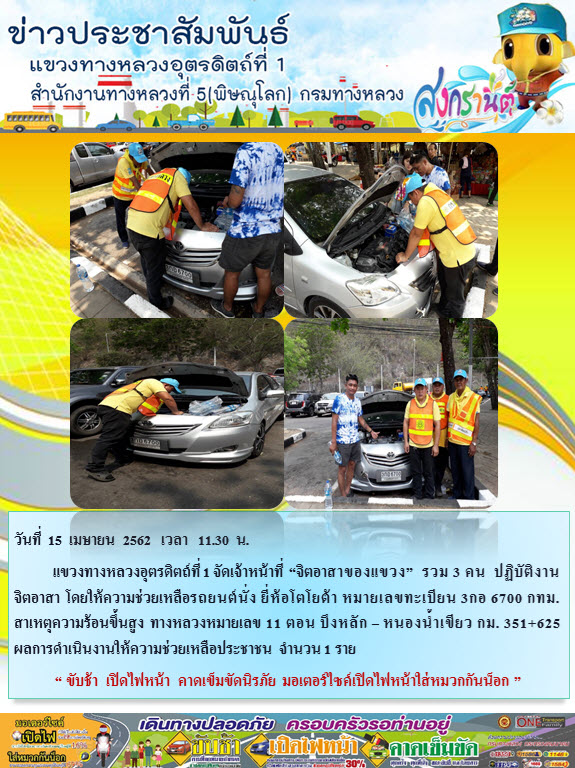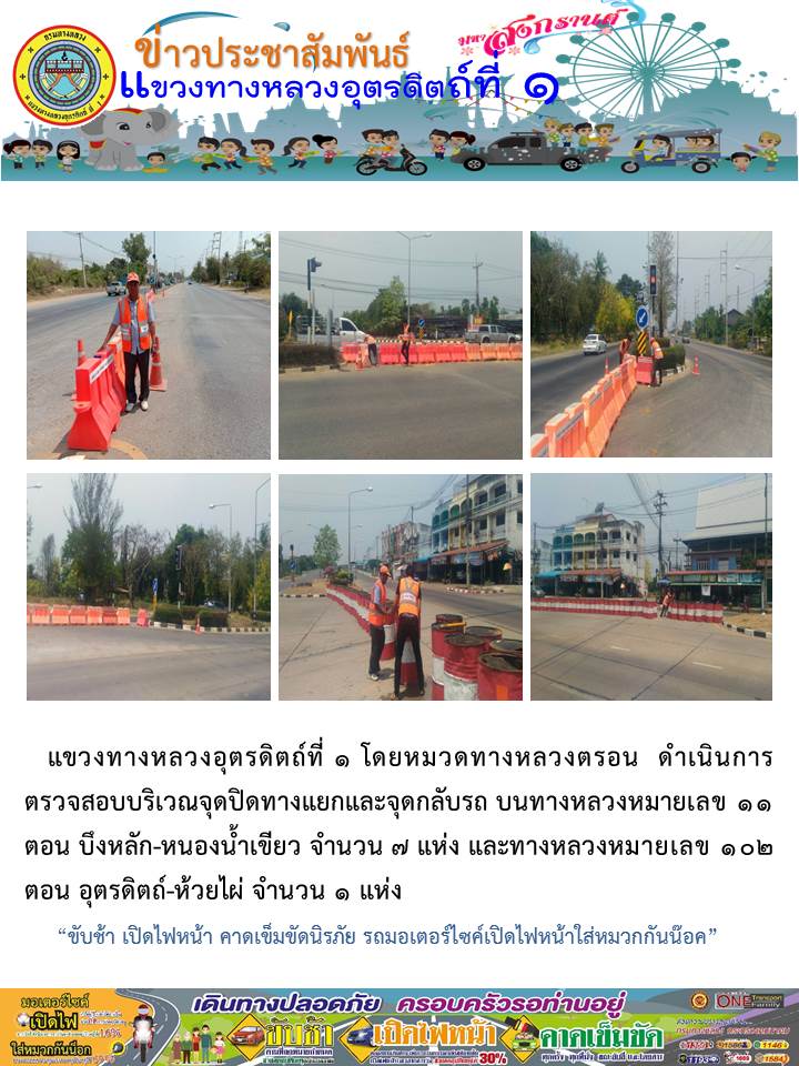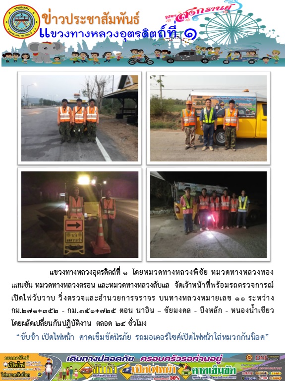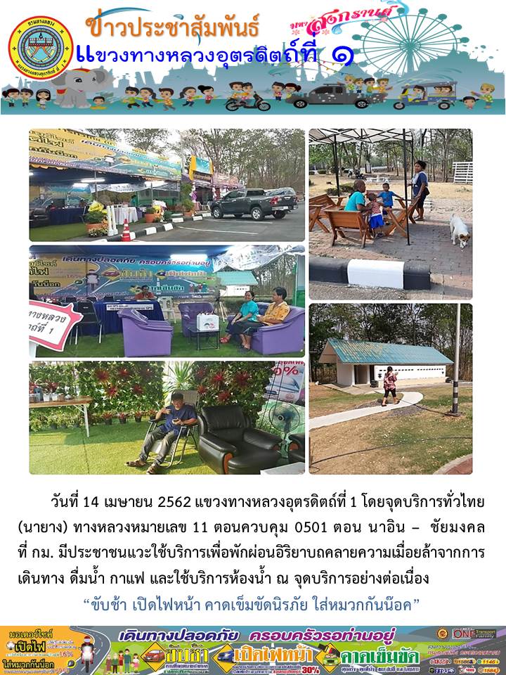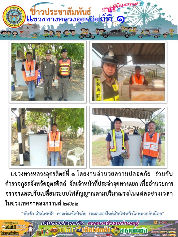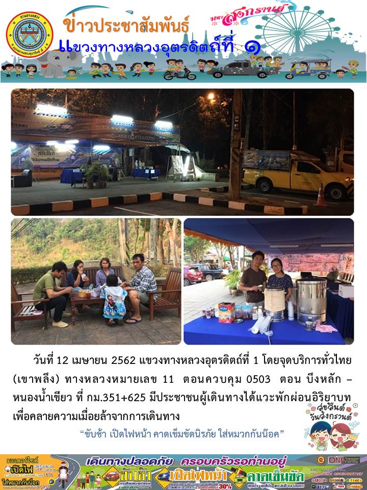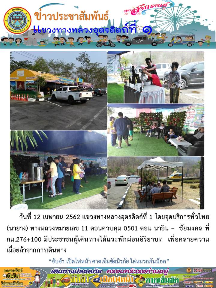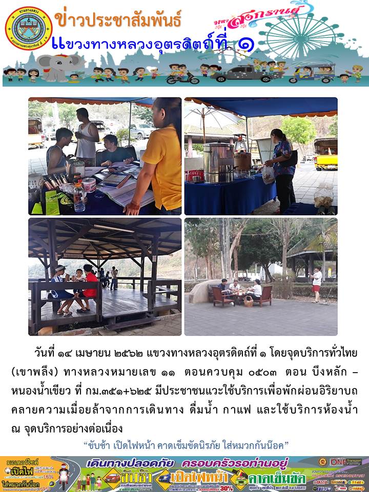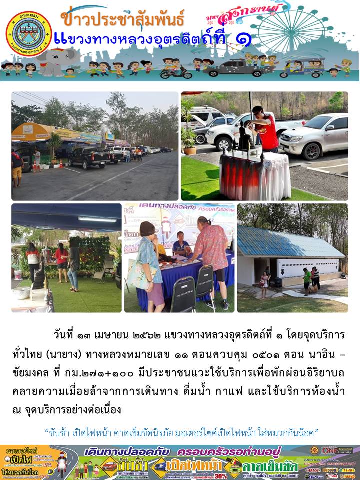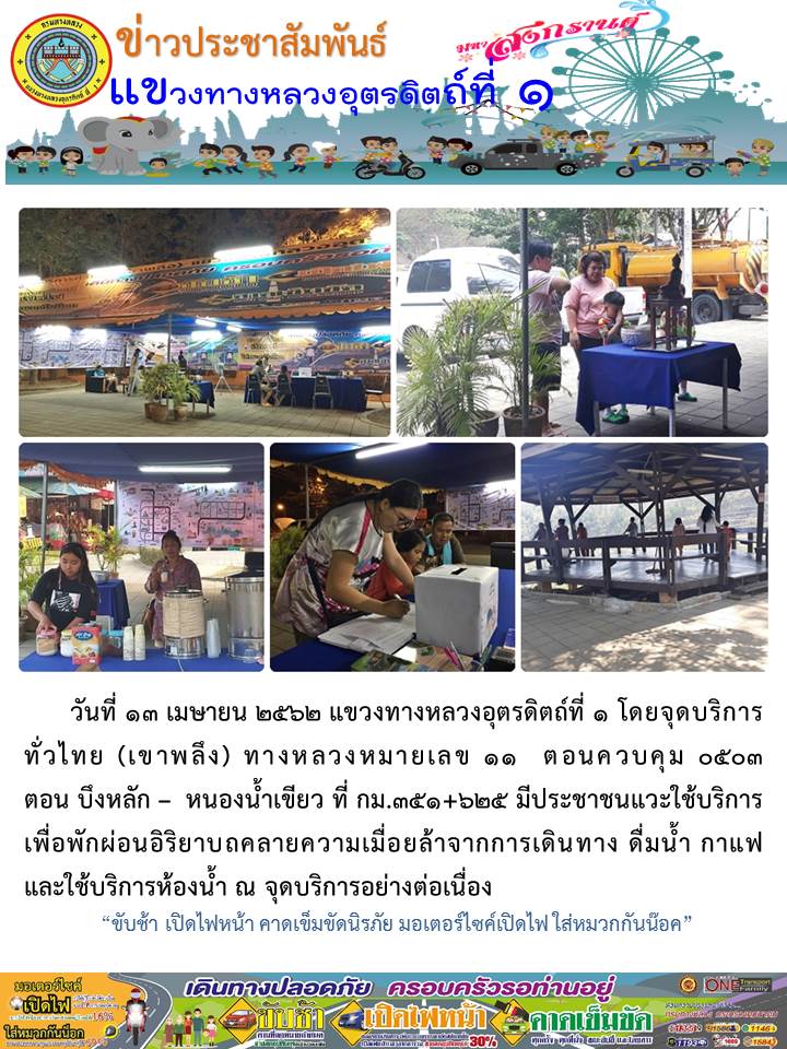 แขวงทางหลวงอุตรดิตถ์ที่ 1 ได้ตั้งจุดบริการประชาชนที่เดินทางในช่วงเทศกาลสงกรานต์ 2562 ดังนี้.-