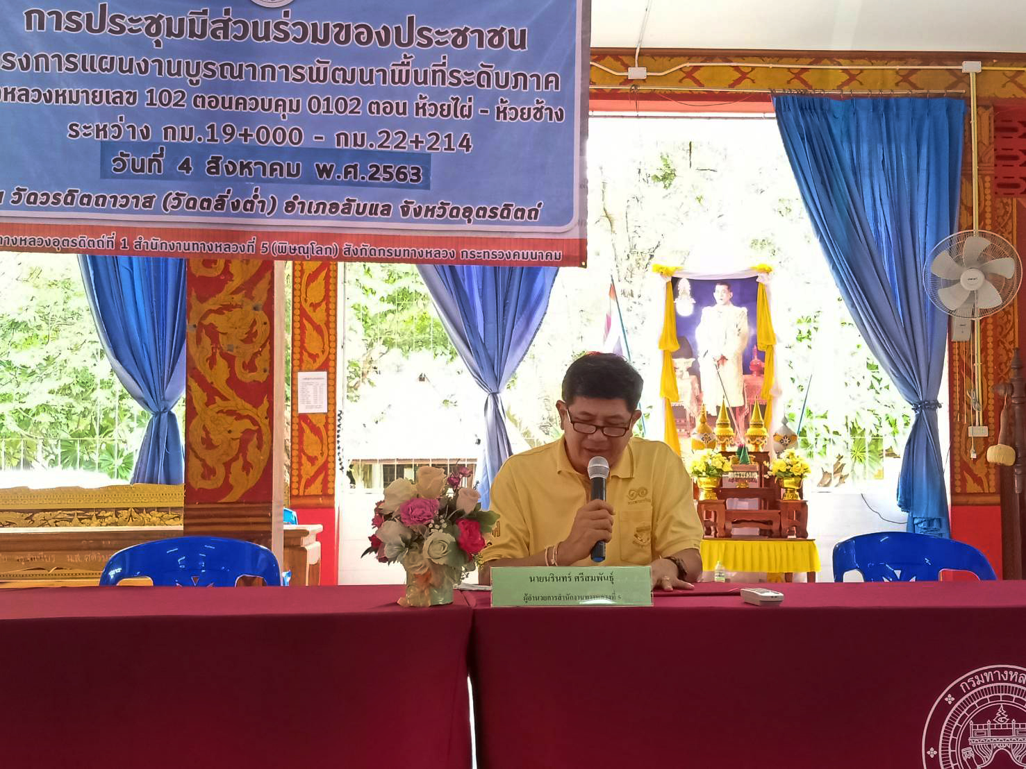 ทั้งนี้ นายกฤษณ์ หย่ำวิไล ผู้อำนวยการแขวงทางหลวงอุตรดิตถ์ที่ 1 พร้อมหัวหน้าส่วนที่เกี่ยวข้องและประชาชนผู้อาศัยสองข้างทางร่วมรับฟังความคิดเห็น ณ วัดวรดิตถาวาส (วัดตลิ่งต่ำ) อำเภอลับแล จังหวัดอุตรดิตถ์