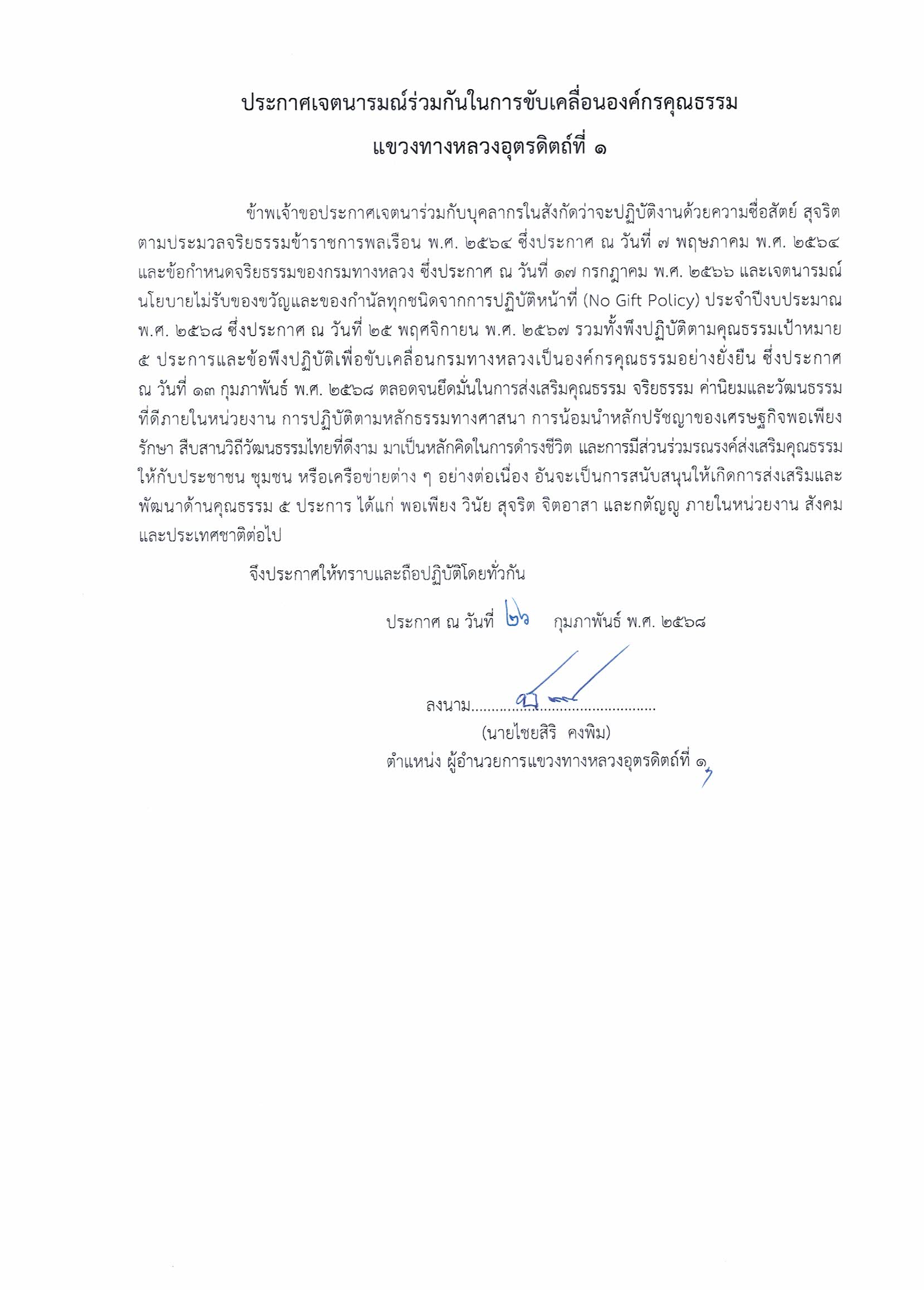 ประกาศเจตนารมณ์ร่วมกันในการขับเคลื่อนองค์กรคุณธรรม ประจำปีงบประมาณ 2568