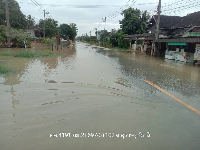 3.) ทล.4191 ช่วง ไชยา-เขาหลัก กม.2+697-3+102 ระดับน้ำสูง 5 ซม. พื้นที่ อ.ไชยา จ.สุราษฎร์ธานี