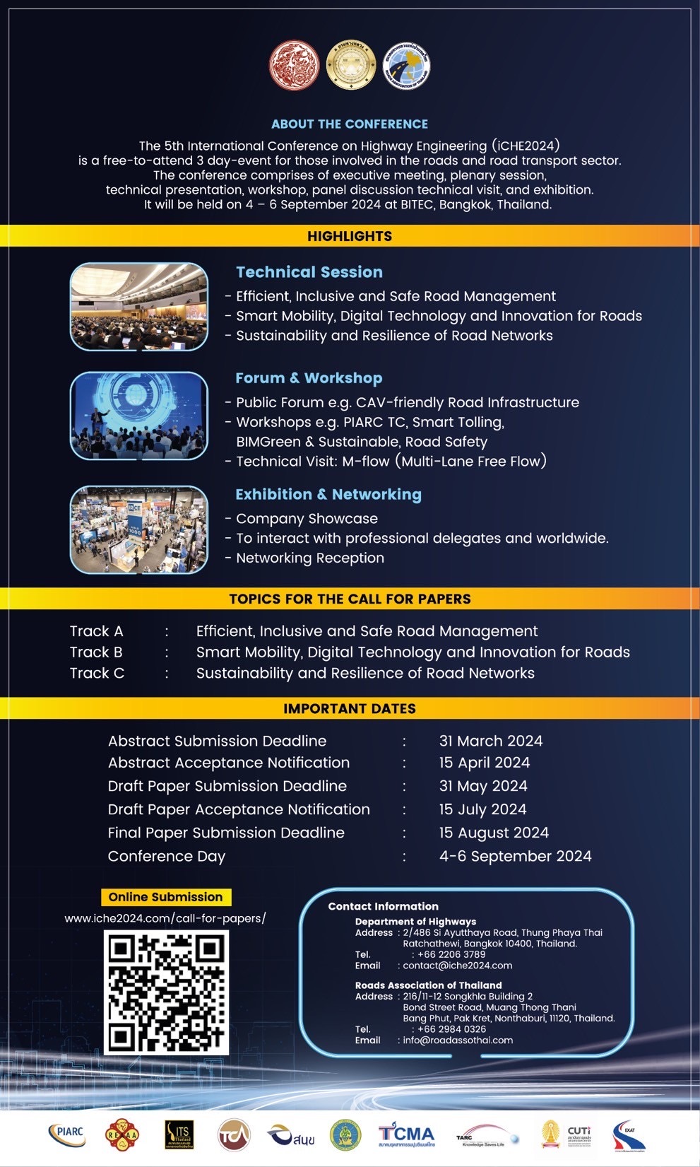 ทั้งนี้ กรมทางหลวง ขอเชิญชวนผู้ที่สนใจเข้าร่วมงาน สามารถลงทะเบียนเข้าร่วมงานโดยไม่มีค่าใช้จ่ายได้ที่ https://www.iche2024.com หรือสอบถามข้อมูลทางโทรศัพท์ 0 - 2206 - 3789 และ อีเมล์ contact@iche2024.com ตั้งแต่บัดนี้เป็นต้นไป